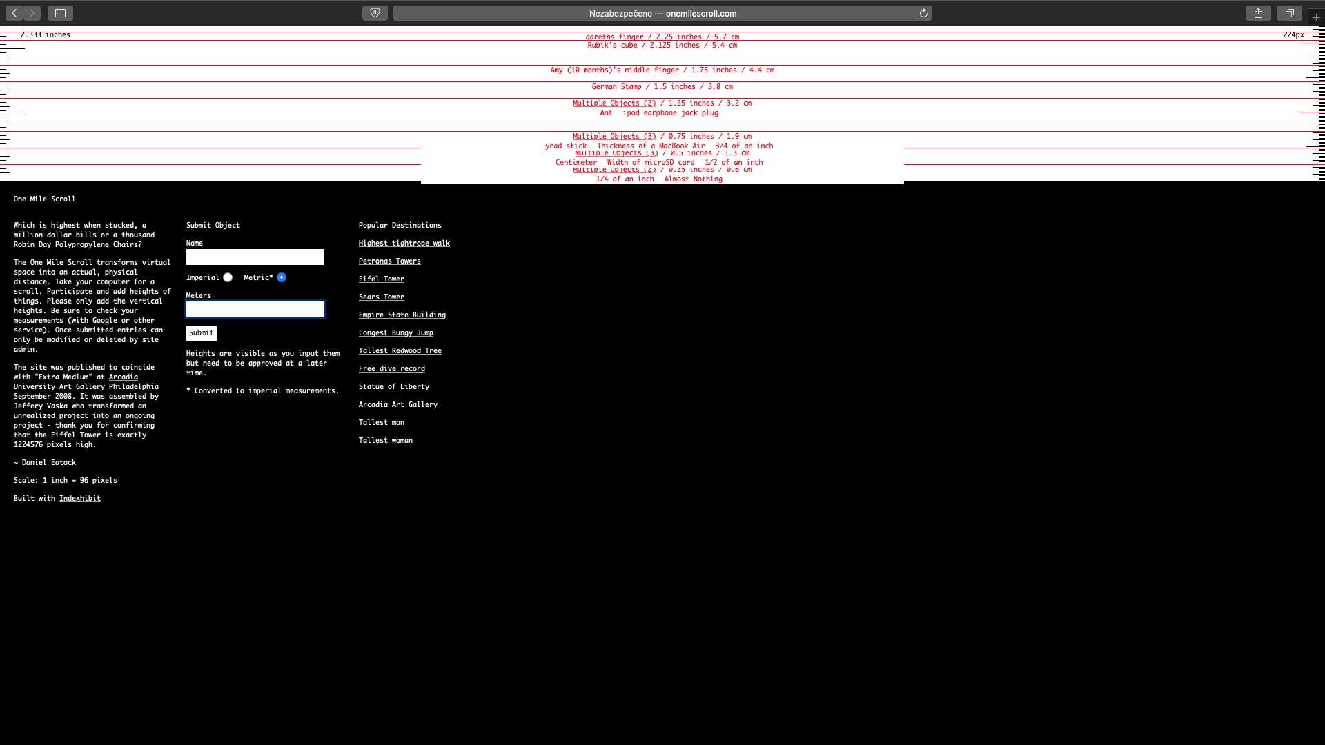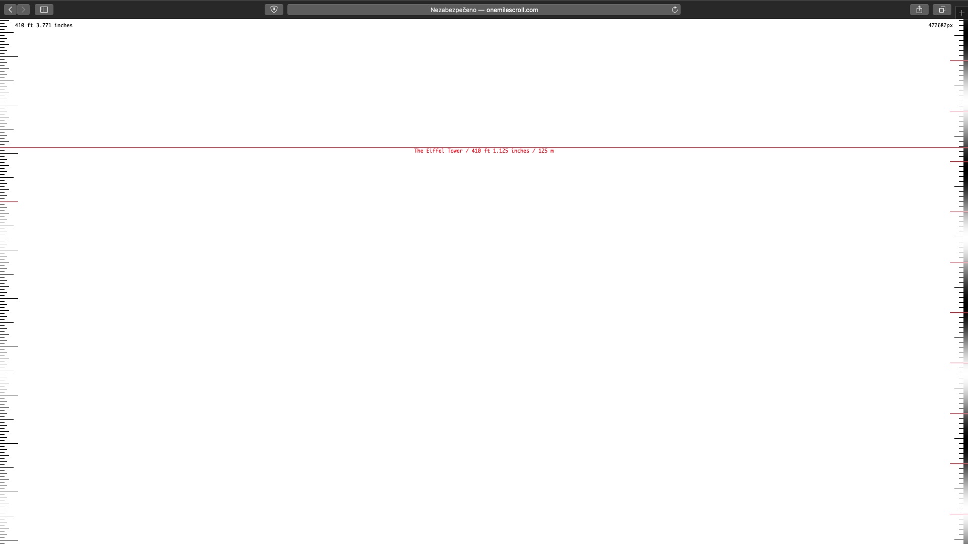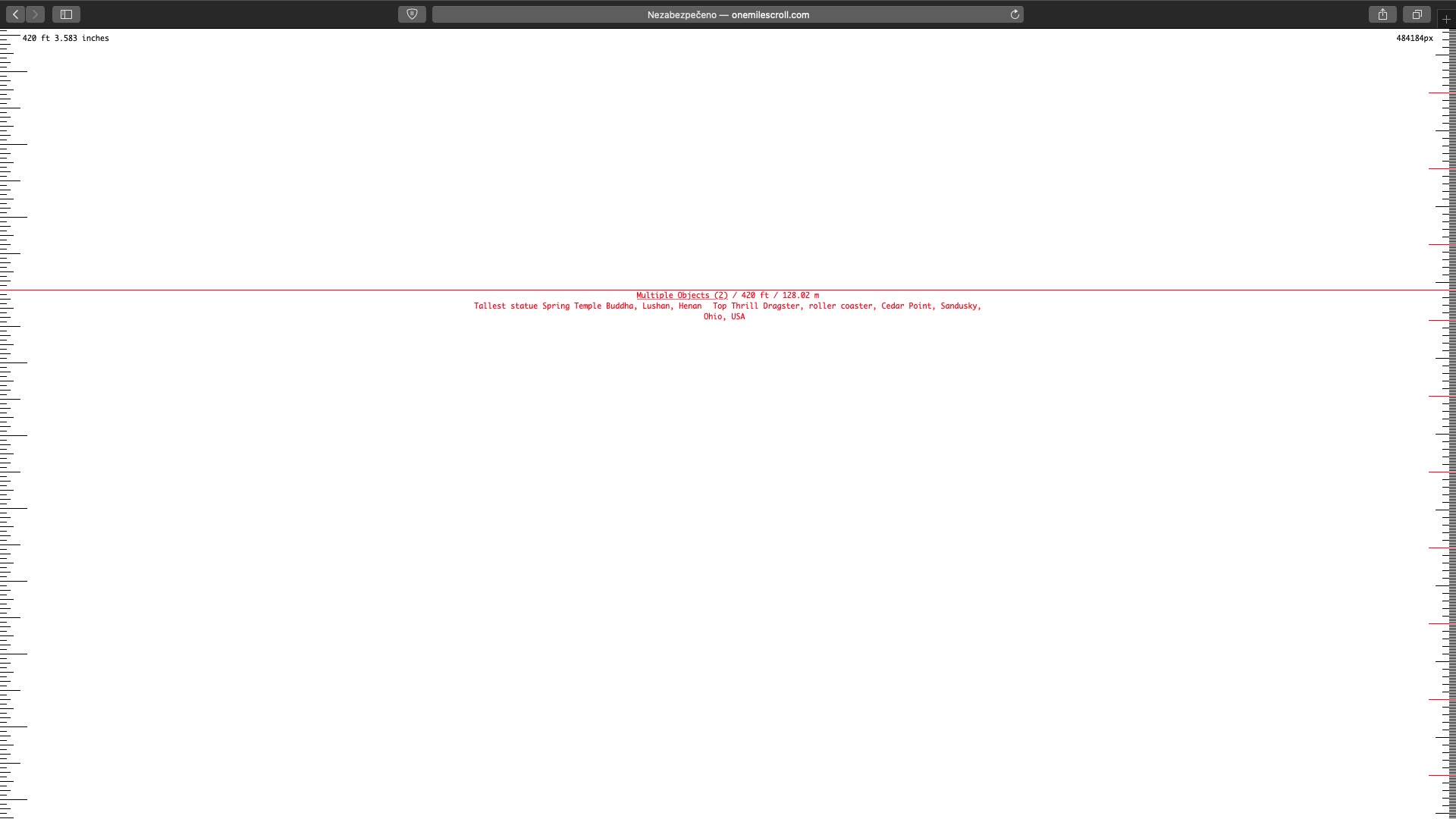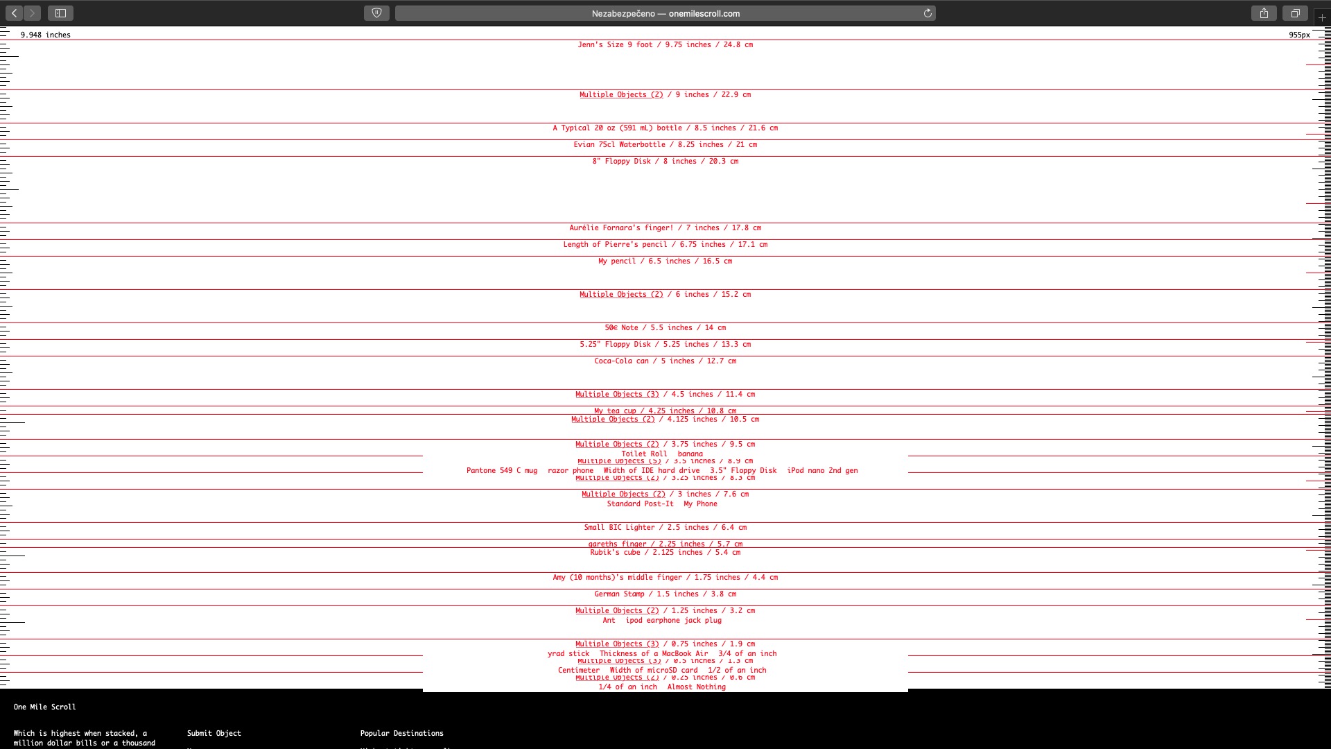 Přemýšleli jste někdy nad tím, jak dlouho byste se na internetové stránce museli posouvat níž a níž, dokud byste „neujeli“ nějakou vzdálenost? Pokud ano, máme pro vás tip na zajímavou stránku s názvem One Mile Scroll. Jak už název napovídá, tak v rámci této stránky budete scrollovat, a to celou jednu míli, respektive 1,6 kilometrů. One Mile Scroll však není jen o tom dojet na samotný konec stránky a říct si, že jste splnili úkol. V rámci scrollování se totiž na stránce objevují linky, které značí, jak moc je vysoká určitá věc. Jednoduše si tak můžete udělat přehled o výšce nějakých budov, předmětů či lidí.