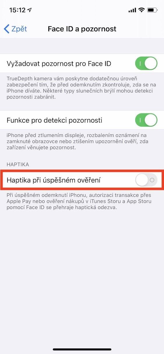 Jak nastavit haptickou odezvu při úspěšném ověření přes Face ID