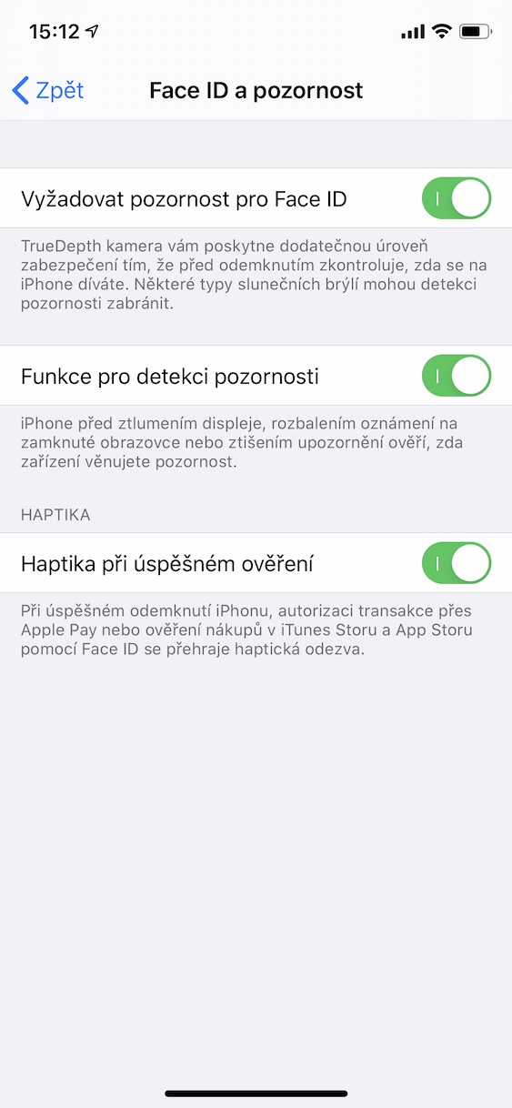 Kromě toho, že si v této sekci nastavení můžete aktivovat haptickou odezvu při úspěšném ověření pomocí Face ID, zde můžete upravit další dvě věci. Funkce Vyžadovat pozornost pro Face ID zaručuje to, že se iPhone neodemkne bez toho, aniž byste se na něj přímo dívali. Druhá funkce s názvem Funkce pro detekci pozornosti dokáže poté identifikovat to, zdali se na iPhone díváte či nikoliv, podle čehož usoudí, zdali má po uplynutí určité doby iPhone uzamknout, či nikoliv.