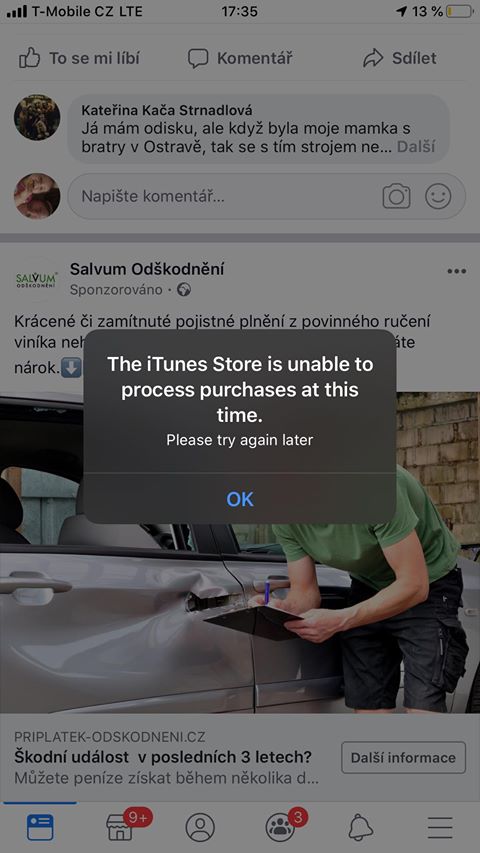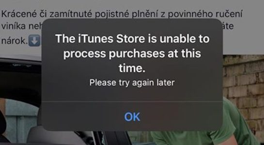 Zdá se, že služby Applu sužuje nová poměrně nepříjemná chyba. Uživatelé z celého světa si totiž dnes začali stěžovat, že se jim na iPhonech a iPadech zobrazuje zničehonic okno s hláškou “The iTunes Store is unable to process purchases at this time. Please try again later,” tedy ve zkráceném překladu upozornění problém se zpracování nákupu na iTunes. Fór je však v tom, že žádné nákupy postižení uživatelé neprovedli a tudíž netuší, k čemu přesně se výstraha váže.
