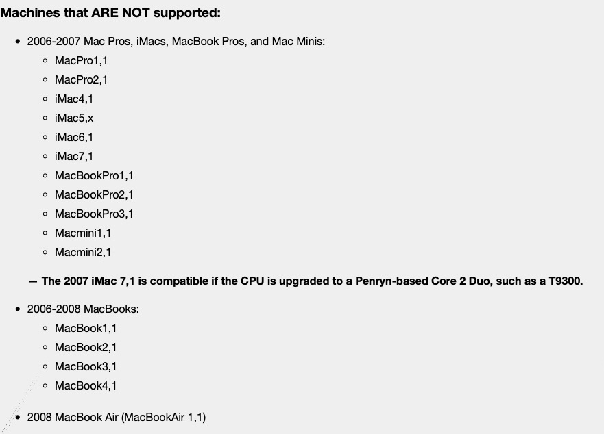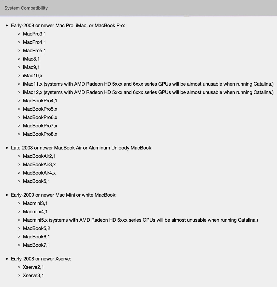 Nástroj, pomocí kterého můžete macOS 10.15 Catalina nainstalovat i na starší zařízení, lze využít prakticky na všech Macích a MacBoocích, které vyšly od roku 2008. Naopak, nástroj nemůžete využít na zařízeních starších, než z roku 2008, a také na specifických zařízeních přímo z roku 2008. Celkový přehled podporovaných a nepodporovaných zařízení najdete v galerii vedle tohoto odstavce.