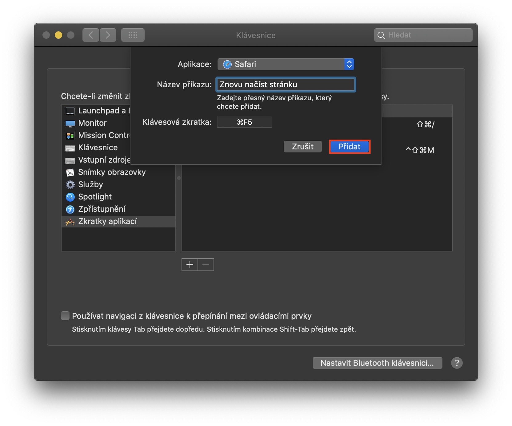 Pokud chcete klávesovou zkratku z nějakého důvodu změnit, tak samozřejmě můžete. Není to nic složitého. Stačí se přesunout do Předvoleb systému, kde rozklikněte sekci Klávesnice. Poté v horním menu zvolte možnost Zkratky a v levém menu se přesuňte do kategorie Zkratky aplikací. Zde poté stiskněte ikonu + a v novém okně vyberte aplikaci Safari, Název příkazu zvolte přesně (bez uvozovek) „Znovu načíst stránku“ a jako Klávesovou zkratku zvolte tu, kterou požadujete. Poté klikněte na Přidat.
