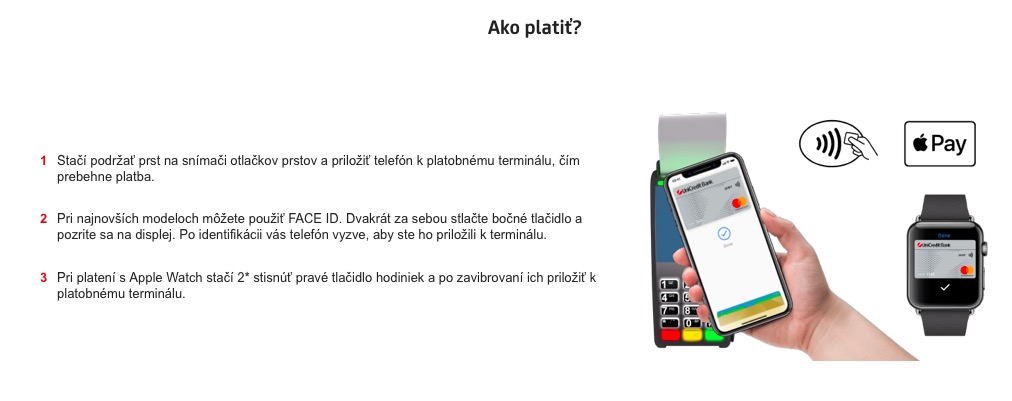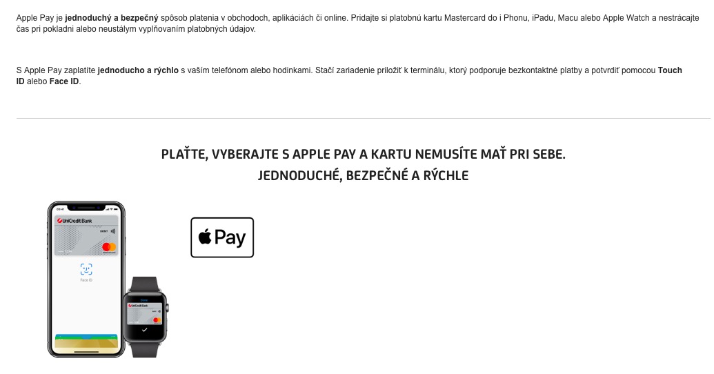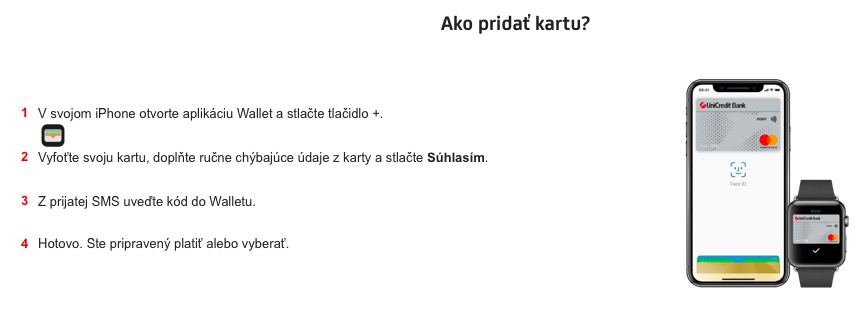 Šťastný den dnes mají i slovenští jablíčkáři využívající služby UniCredit Bank. Jejich banka totiž též ráno spustila podporu Apple Pay, což pro ně znamená jediné – platby iPhonem či Apple Watch, potažmo Macem na internetu si už mohou užít i oni. Naopak s platebními kartami se mohou konečně rozloučit. Zatímco v Česku UniCredit Bank zprovoznila Apple Pay již 16. července, Slováci využívající stejnou banku v jejich zemi si museli zřejmě kvůli zdlouhavým vyjednáváním podmínek s Applem počkat téměř další tři měsíce. Ode dneška jim však již nic v přidání karty nebrání. Samotná banka spustila kvůli Apple Pay mikrostránku, na které se mohou její klienti dozvědět jak jí nastavit a potažmo jak přes ní platit. Nechybí tu ani sekce často kladených dotazů, ve kterých naleznete odpovědi například na to, zda může být jedna karta umístěna