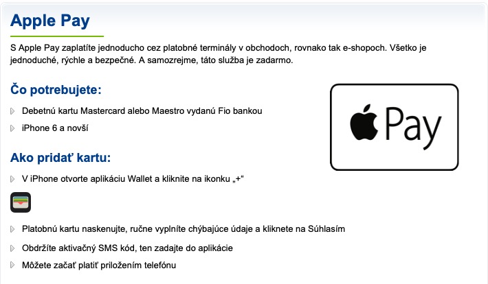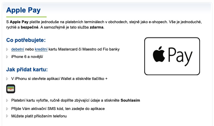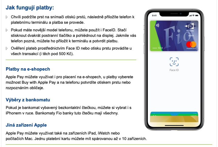 Samotná aplikace i její používání je samozřejmě zdarma. Platit s Apple Pay je možné také na e-shopech. Mobilem lze také vybírat z bankomatů, které podporují bezkontaktní výběry. U Fio banky tuto funkci nabízí všechny bankomaty. Aktuálně je možné do aplikace přidávat debetní i kreditní karty Mastercard a Maestro.