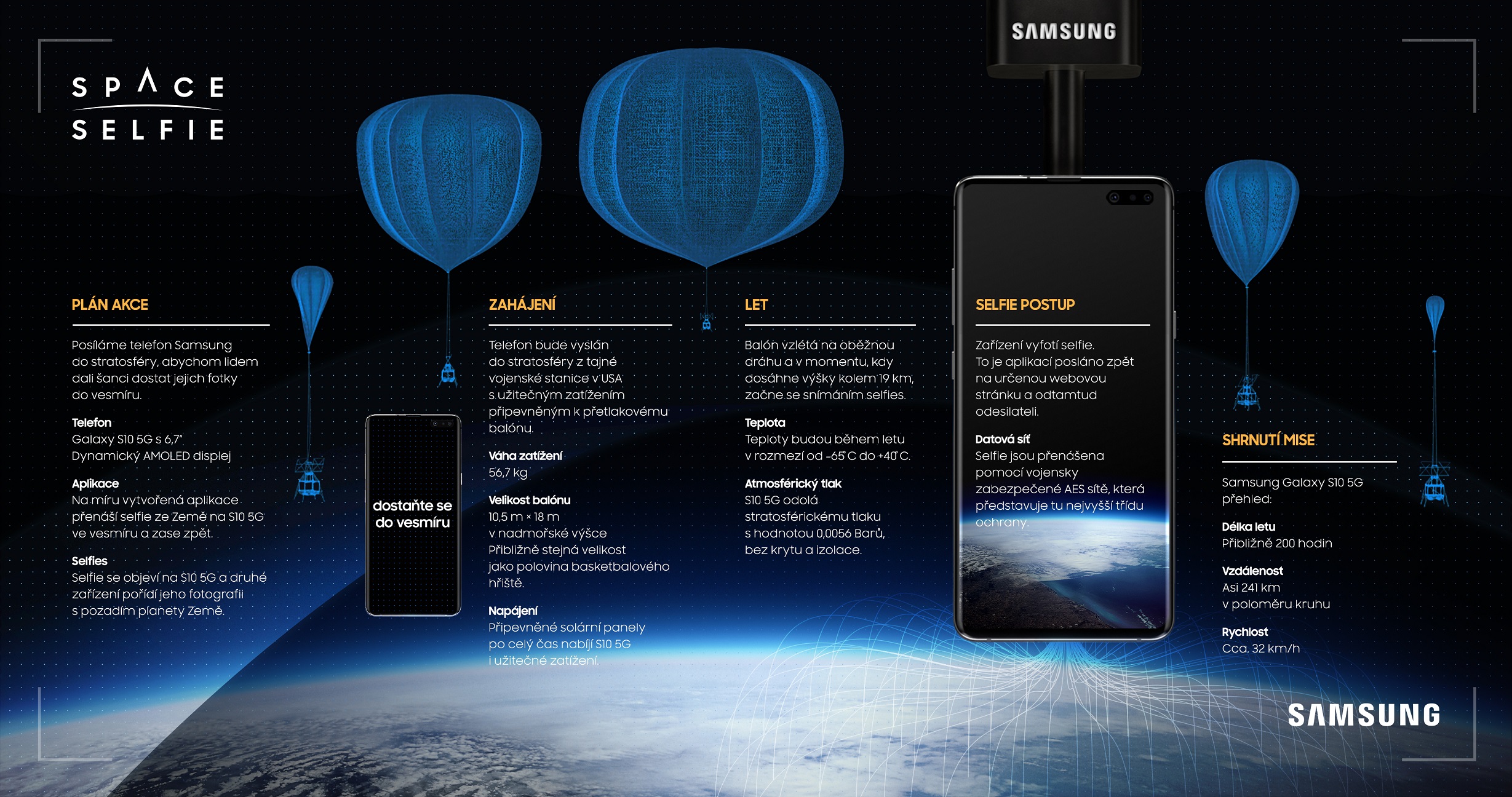 Prostřednictvím SpaceSelfie prokazuje společnost Samsung průkopnického ducha značky a stanovuje nový standard pro potenciál mobilních technologií. S10 5G bude po dobu více než 200 hodin, které stráví na hranici zemské atmosféry, demonstrovat sílu inovací společnosti Samsung a její trvalé úsilí o vývoj produktů, které umožňují dělat to, co bylo dříve nemožné.