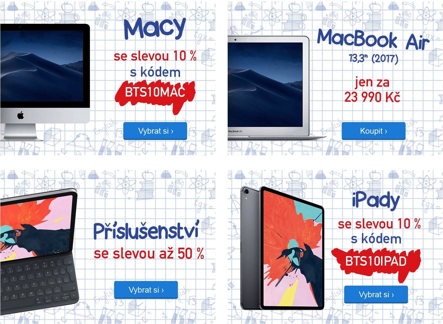 Komerční sdělení: Akce Back to school začala již 18. 8. a všem studentům i pedagogům přinesla skvělé slevy na vybrané MacBooky, iPady, sluchátka Beats a další produkty. K získání slevy přitom stačilo jen použít příslušný slevový kód a předložit průkaz ISIC.