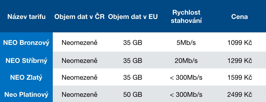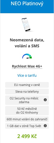 Společnost O2 nabízí neomezené tarify s názvem NEO. Cena tarifů, kombinujících neomezené volání, SMS a data, začíná na 1099 korunách. O2 nabízí veřejně celkem čtyři neomezené základní tarify, přičemž limity opět spočívají v přenosové rychlosti. Na rozdíl od T-Mobilu je ale rychlost nastavená pevně od samého počátku a objem dat je skutečně neomezený. Čím více si tedy připlatíte, tím rychleji můžete surfovat bez obav o vyčerpání stanoveného limitu objemu dat. Součástí každého z tarifů jsou i další výhodné nabídky, jako je služba O2 Security po určitou dobu zdarma, sleva na telefony nebo přístup do O2 knihovny. Samozřejmostí je EU roaming v ceně.