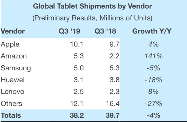 Podle dat Strategy Analytics se Applu podařilo v uplynulém čtvrtletí prodat na 10,1 milionů kusů iPadů, zatímco ve stejném čtvrtletí v loňském roce dokázal prodat “jen” 9,7 milionů iPadů. Meziročně si tak Apple polepšil o 4 % a dál suverénně vládne trhu s tablety. Prodejní úspěch zaznamenal v uplynulém čtvrtletí kromě Applu i Amazon, jehož prodeje se meziročně v uplynulém čtvrtletí zvýšily z 2,2 na 5,3 milionů kusů. Stěžovat si nemůže v tomto směru ani Lenovo, které ve stejném období poposkočilo o 0,2 milionu kusů – konkrétně z 2,3 milionů na 2,5 milionu.