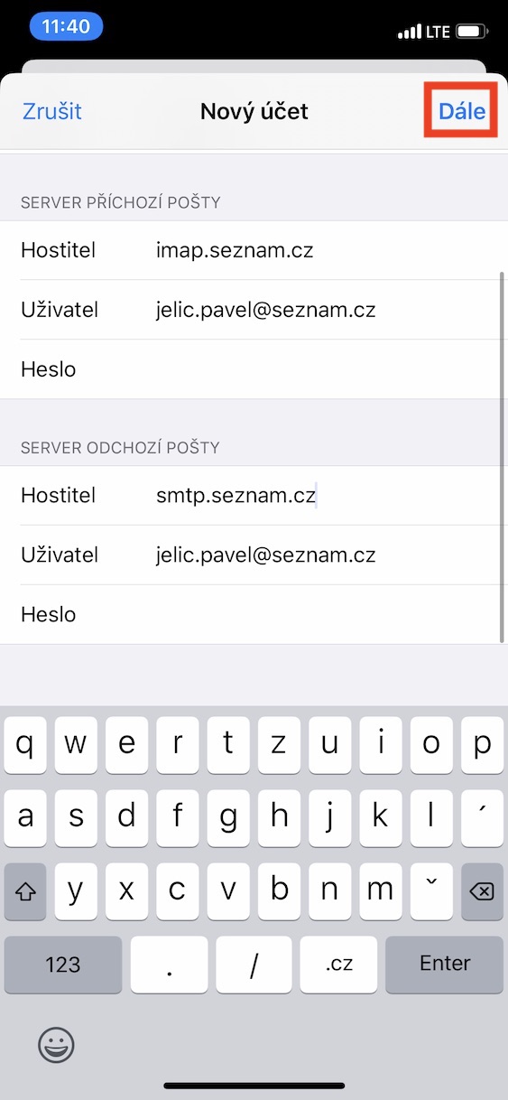 Na vašem iPhonu (či iPadu) otevřete nativní aplikaci Nastavení, kde se přesuňte níže, dokud nenarazíte na možnost Hesla a účty, na kterou klikněte. Poté klepněte na možnost Přidat účet a ze seznamu nabízených služeb vyberte možnost Jiný. V dalším okně klepněte na první možnost s názvem Přidat poštovní účet. Jako jméno zvolte název e-mailové schránky, do kolonky E-mail napište přesné znění vaší e-mailové schránky (tzn. například petr.novak@seznam.cz), do hesla vložte heslo k e-mailové schránce, a poté si zvolte popis (nepovinné). Jakmile tyto záležitosti vyplníte, tak klepněte v pravém horním rohu na tlačítko Dále. Poté se objeví další nastavení, kde možná většina z vás ztroskotala.