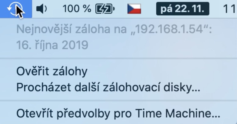 I v případě Time Machine se může klávesa Option hodit. V klasickém případě, tedy po stisknutí ikony Time Machine bez tlačítka Option, se zobrazí možnosti pro spuštění zálohování, otevření Time Machine, anebo zobrazení předvoleb Time Machine. Pokud na ikonu kliknete společně se stisknutým tlačítkem Option, tak se zobrazí možnosti pro přeskočení zálohy a pro procházení dalších zálohovacích disků.