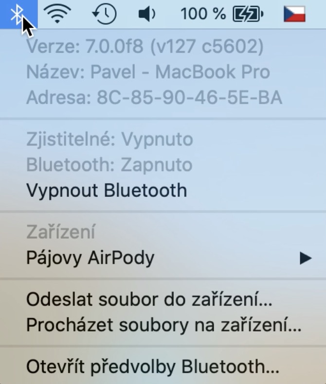 I v případě ikony Bluetooth získáte se stisknutou klávesou Option mnoho dalších informací. Zatímco po klasickém kliknutí se zobrazí pouze možnost pro vypnutí Bluetooth a připojení k zařízení, tak po stisknutí Option získáte navíc informace o názvu vašeho zařízení, o jeho adrese, verzi a zjistitelnosti.