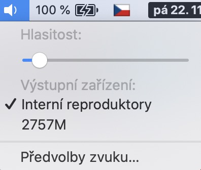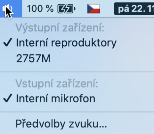 Pokud kliknete na ikonu zvuku bez stisknutého tlačítka Option, tak se vám zobrazí posuvník hlasitosti společně s možností nastavení Výstupních zařízení. Pokud však na ikonu hlasitosti kliknete společně s tlačítkem Option, tak se vám navíc zobrazí ještě Vstupní zařízení. Přijdete však o posuvník hlasitosti, tudíž je třeba se s využitím klávesy Option v tomto případě naučit, abyste pokaždé zobrazili to, co potřebujete.