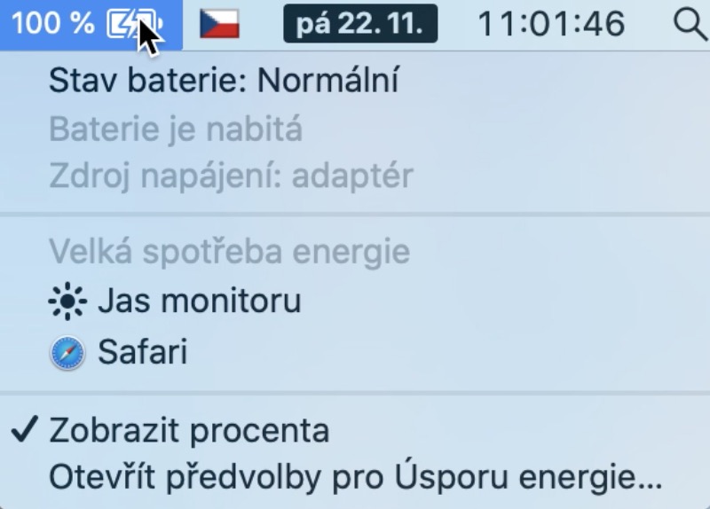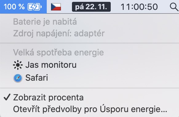 V případě, že kliknete na ikonu baterie bez tlačítka Option, tak se zobrazí základní informace o baterii, jako je například stav nabíjení, anebo aplikace, které mají velkou spotřebu energie. Pokud kliknete na ikonu baterie společně s tlačítkem Option, tak se přidá možnost Stav baterie. Zde se vám zobrazí, zdali není baterie třeba vhodná k výměně.