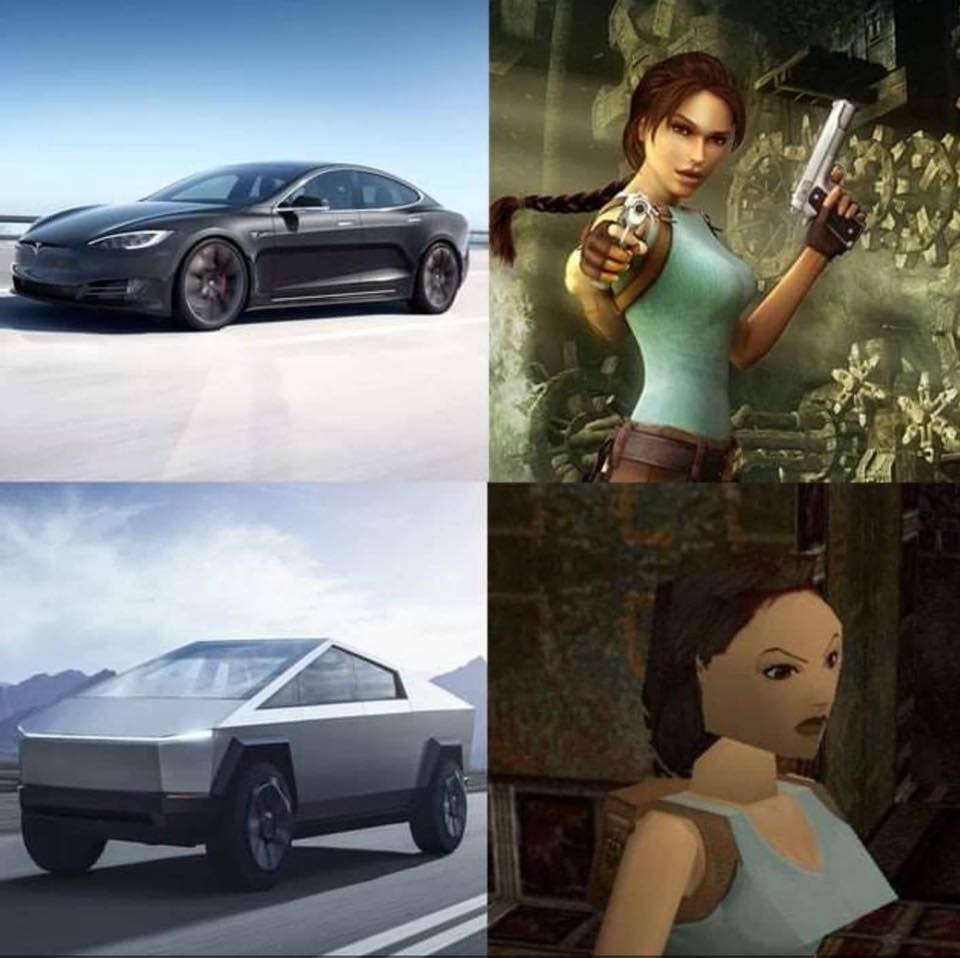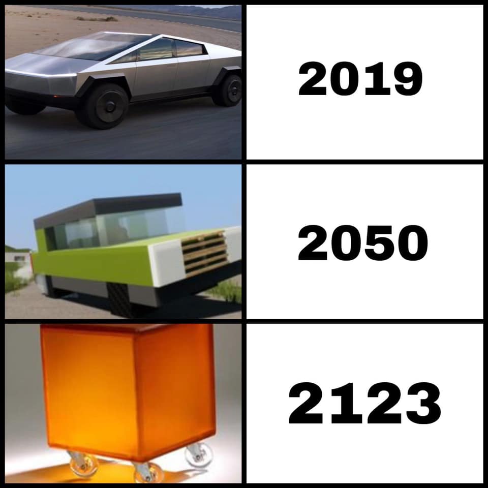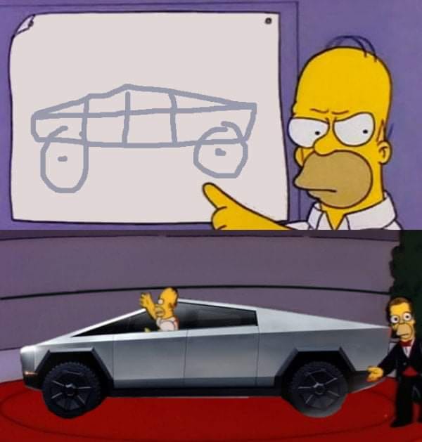 Tento vůz, který by měl jít do masové výroby koncem roku 2021, se bude prodávat ve třech verzích. Nejlevnější z nich vyjde na 39 900 dolarům, na jedno nabití ujede prý 400 kilometrů, utáhne 3,5 tuny a z 0 na 100 zrychlí za 6,5 vteřiny. Prostřední model bude osazen dvěma elektromotory, které nabídnou dojezd 480 kilometrů. Vůz utáhne 4,5 tuny a do prodeje půjde za 49 990 dolarů. Nejvýkonnější varianta utáhne 6,3 tuny. Z 0 na 100 zrychlí za 2,9 vteřiny a nabídne skvělý dojezd 800 kilometrů na jedno nabití. Cena bude 69 900 dolarů. Ať už si o vzhledu Cybetrucku myslíte cokoliv, mnoha lidem se líbí. Tento víkend se Elon Musk na svém Twitteru pochlubil, že Cybertruck má 200 tisíc předobjednávek. Kdyby jste narazili na nějaké memes, ktere se v galerii nevyskytují, pochlubte se v komentářích a my je do galerie zařadíme.