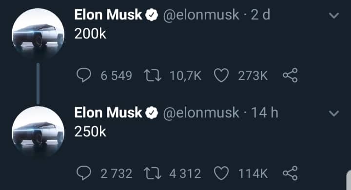 Zhruba před týdnem Tesla ukázala světu svůj nový elektromobil Cybertruck, který bude prodáván ve třech verzích. Nejlevnější z nich vyjde na 39 900 dolarů, na jedno nabití ujede prý 400 kilometrů, utáhne 3,5 tuny a z 0 na 100 zrychlí za 6,5 sekundy. Prostřední model bude osazen dvěma elektromotory, které nabídnou dojezd 480 kilometrů. Vůz utáhne 4,5 tuny a do prodeje půjde za 49 990 dolarů. Nejvýkonnější varianta utáhne 6,3 tuny. Z 0 na 100 zrychlí za 2,9 sekundy a nabídne skvělý dojezd 800 kilometrů na jedno nabití. Cena bude 69 900 dolarů. Elon Musk nyní hlásí, že vůz má už 250 tisíc předobjednávek, přičemž první vozy vyjedou z linky na přelomu roků 2021 a 2022.