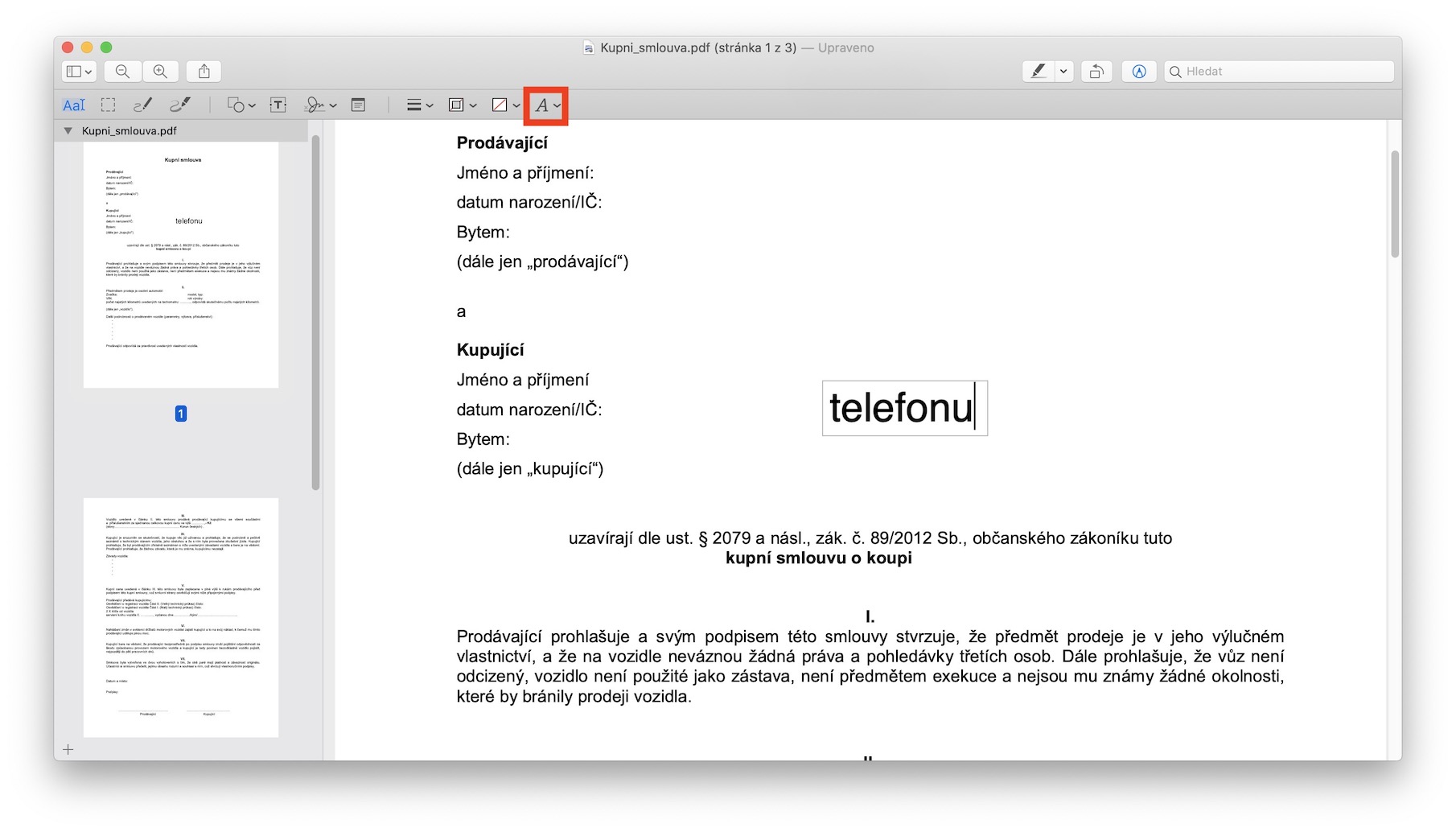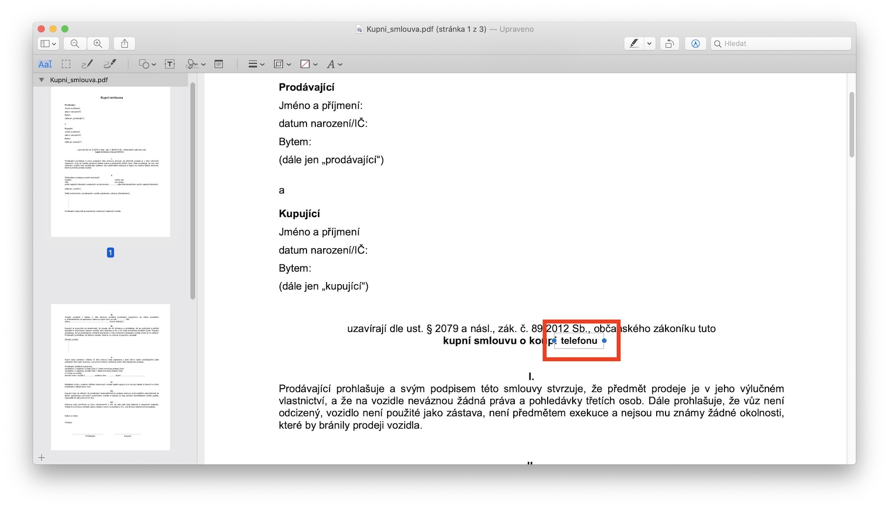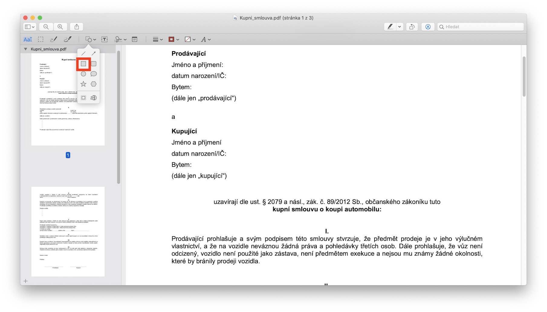 Čas od času se můžete ocitnout v situaci, kdy potřebujete uvnitř PDF dokumentu přepsat nějakou frázi, anebo nějaké slovo. PDF soubor však nefunguje jako klasický soubor, který otevřete ve Wordu, anebo v Pages a můžete jej ihned přepsat. Pokud tedy chcete nějaký text v PDF souboru přepsat, tak je nutné jej prvně zakrýt, a poté vytvořit úplně nové textové pole. Zakrytí můžete provést jakýmkoliv objektem, například obdélníkem. Obdélník můžete do dokumentu vložit tak, že v pravé horní části okna kliknete na tlačítko anotací, a poté vlevo rozkliknete tvary a zvolíte obdélník. Nastavte mu správnou barvu, a poté ním překryjte text, který chcete upravit. Jakmile tak učiníte, tak už jen stačí stisknout tlačítko pro přidání textového pole, napsat co potřebujete, opět zvolit barvu a styl písma, a je hotovo.