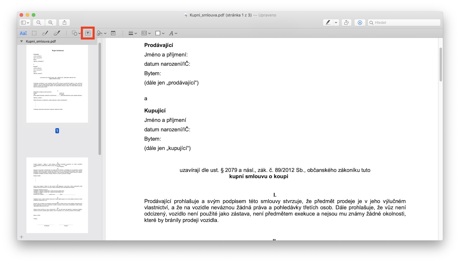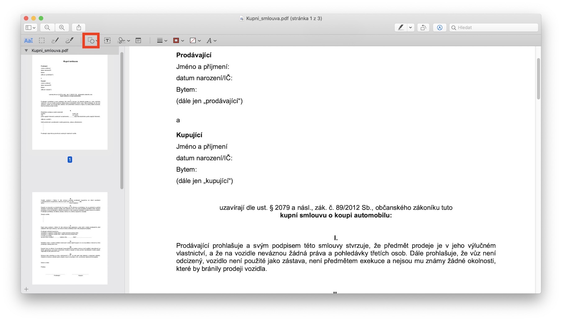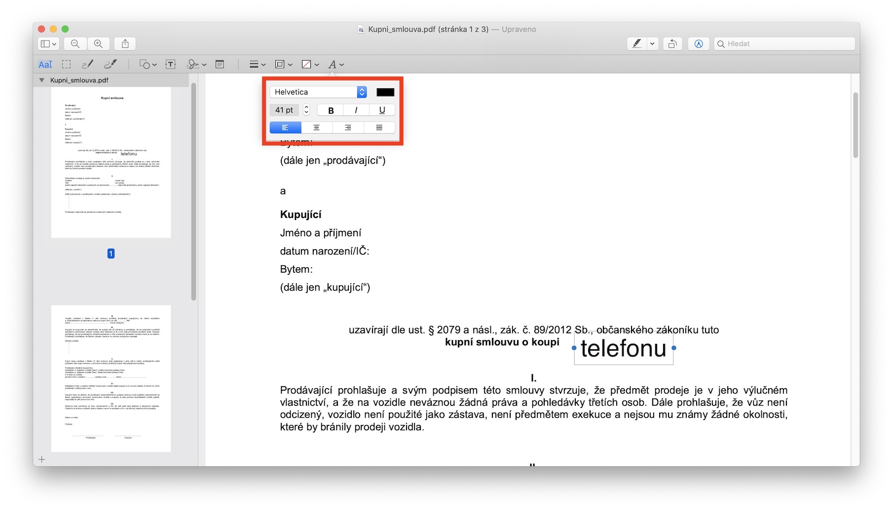 Čas od času se můžete ocitnout v situaci, kdy potřebujete uvnitř PDF dokumentu přepsat nějakou frázi, anebo nějaké slovo. PDF soubor však nefunguje jako klasický soubor, který otevřete ve Wordu, anebo v Pages a můžete jej ihned přepsat. Pokud tedy chcete nějaký text v PDF souboru přepsat, tak je nutné jej prvně zakrýt, a poté vytvořit úplně nové textové pole. Zakrytí můžete provést jakýmkoliv objektem, například obdélníkem. Obdélník můžete do dokumentu vložit tak, že v pravé horní části okna kliknete na tlačítko anotací, a poté vlevo rozkliknete tvary a zvolíte obdélník. Nastavte mu správnou barvu, a poté ním překryjte text, který chcete upravit. Jakmile tak učiníte, tak už jen stačí stisknout tlačítko pro přidání textového pole, napsat co potřebujete, opět zvolit barvu a styl písma, a je hotovo.