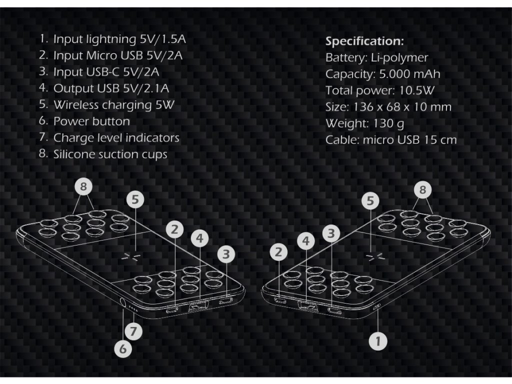 Hledáte-li nevšední powerbanku, která využívá moderních technologií v podobě bezdrátového nabíjení, tak je bezdrátová powerbanka Swissten s přísavkami přesně to pravé ořechové pro vás. Kapacita této powerbanky je 5.000 mAh a dobít ji můžete hned třemi způsoby. Pokud byste se navíc ocitli v situaci, kdy byste potřebovali kromě bezdrátového zařízení dobít zařízení jiné, tak k tomu můžete využít klasický USB výstup. Oba tyto možné výstupy samozřejmě fungují společně bez sebemenších problémů.