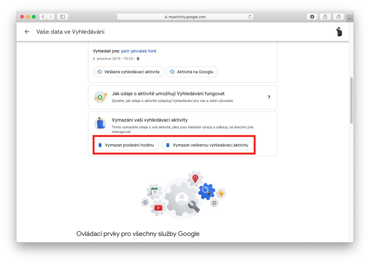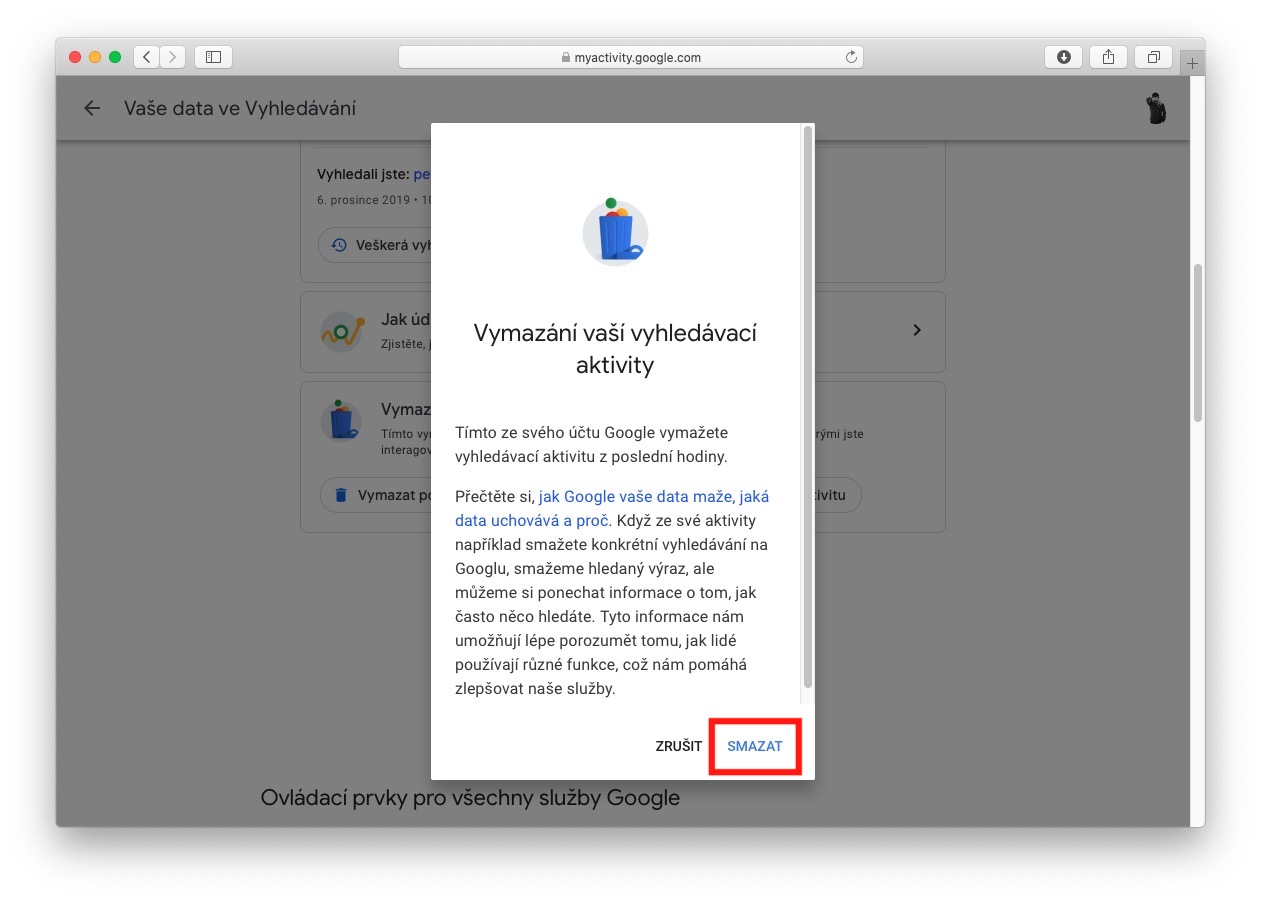 Na vašem macOS zařízení, tzn. na Macu či MacBooku, otevřete váš primární prohlížeč, na kterém chcete záznamy vyhledávání v Googlu odstranit. Jakmile tak učiníte, tak se přesuňte na stránky Google.com. Poté v pravém dolním rohu klikněte na tlačítko Nastavení. Zobrazíse rozevírací menu, ve kterém klikněte na možnost Vaše data ve Vyhledávání. Poté, co na tuto možnost kliknete, tak se objevíte na nové stránce. Zde poté sjeďte o něco níže, kde se nachází vaše poslední záznamy z vyhledávání. Pod nimi už pak naleznete dvě tlačítka pro vymazání vyhledávací aktivity. Pokud chcete aktivitu smazat jen z poslední hodiny, tak klepněte na tlačítko Vymazat poslední hodinu. V případě, že chcete smazat veškerou vyhledávací aktivitu od počátku věků, tak stiskněte tlačítko Vymazat veškerou vyhledávací aktivitu. Tuto akci poté stačí potvrdit stisknutím tlačítka Smazat.