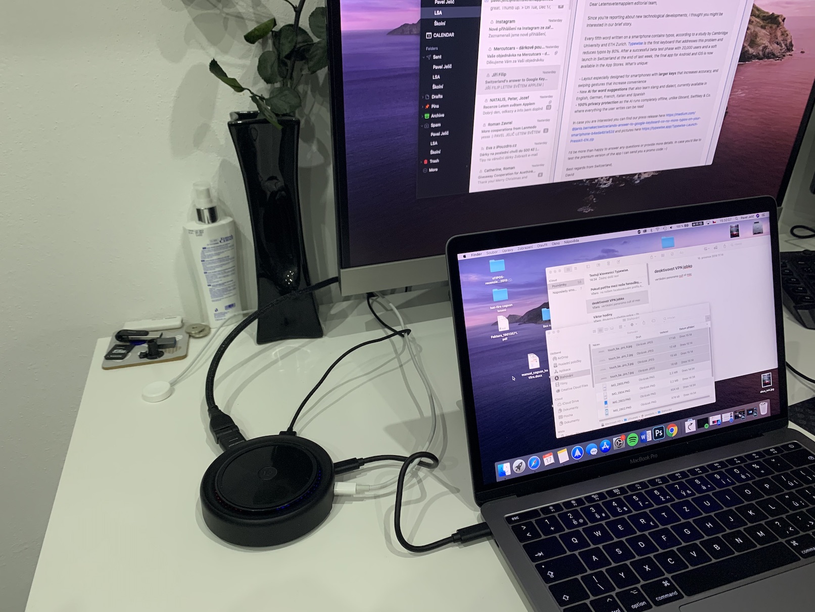 Hub jsem společně s bezdrátovou nabíječkou používal několik dnů a vyměnil jsem jej za můj stávající hub od Epico. To, co mě opravdu velmi mile překvapilo, je fakt, že se hub od Adam elements prakticky vůbec nezahříval. Hub od Epico se po chvilce využívání dostane do takové fáze, že na jeho těle udržíte ruku maximálně několik sekund, což se u CASA Hubu 07 neodehrávalo. Samozřejmě je také příjemná možnost v podobě bezdrátové nabíječky, na které jsem osobně nabíjel nejčastěji AirPody. Osobně však vnímám jako nevýhodu to, že je celý hub ve tvaru kruhu. I přesto, že se porty při připojení nachází jen na jeho jediné půlce, tak je tohle uspořádání lehce nešťastné, jelikož poté máte kabely „rozházené“ po celém stole. Mezi další nevýhodu patří to, že pokud k hubu připojíte nějaký pevnější a tlustší kabel (například HDMI či VGA), tak se celý hub ze stolu kvůli tíze těchto kabelů zvedá. Samozřejmě si ale lze s umístěním kabelů vyhrát, jedná se tedy spíše o takovou nepodstatnou věc.