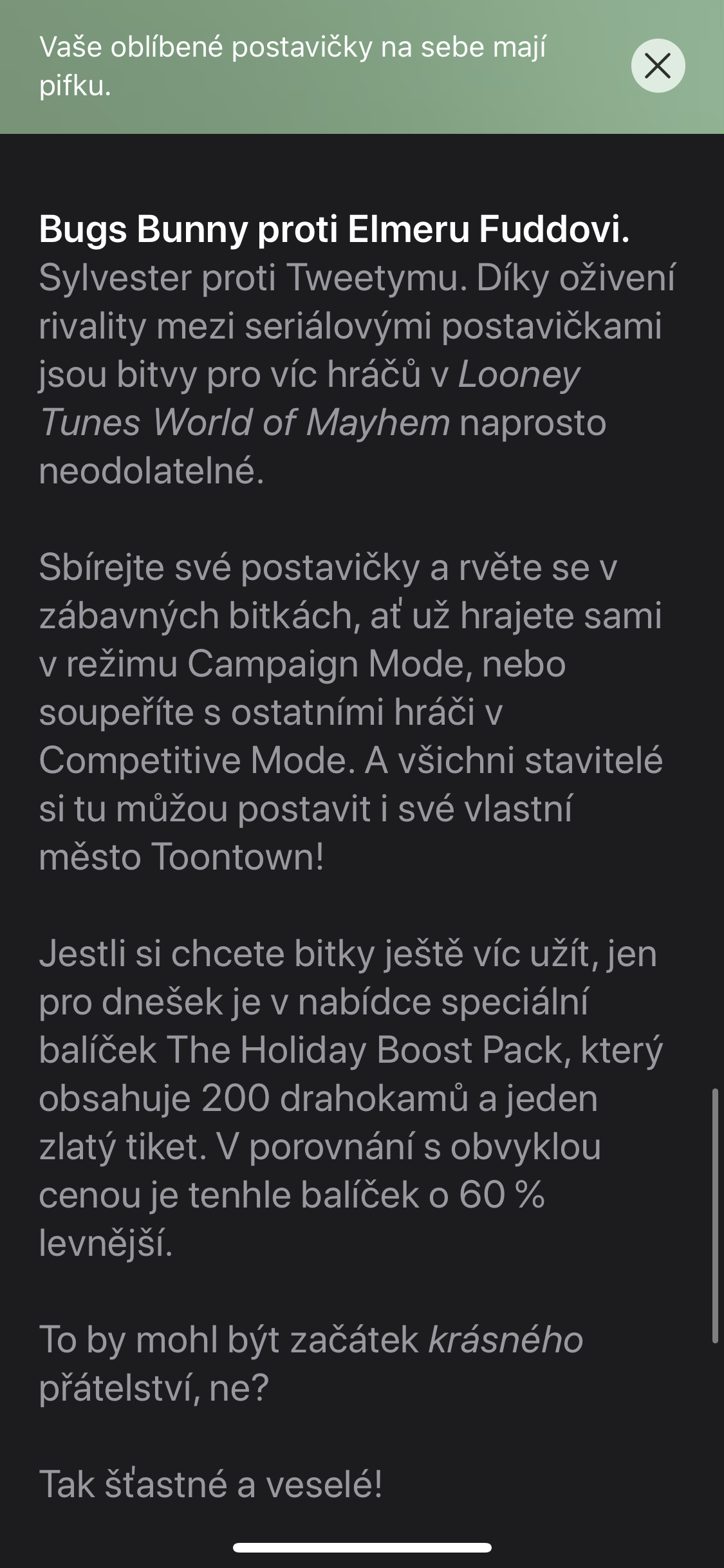 Co přesně si Apple za dárky pro nadcházející dny přichystal není v tuto chvíli jasné, jelikož celou akci prezentuje jako jedno velké překvapení. Aby vám nic neuniklo, bude tedy nutné denně navštívit App Store a zkontrolovat si, co do něj kalifornský gigant přichystal. Pro dnešek jsou to hned dvě zajímavé slevy na aplikace, respektive prvky v nich. První z ní je hra Looney Tunes World of Mayhem, ve které si Apple připravil 60% slevu na in-app nákup balíčku The Holiday Bost Pack. Druhou aplikací je grafický editor Canva, který funguje na bázi předplatného a právě na to nyní Apple nabízí slevu. Konkrétně můžete dnes využít nabídku na předplacení si tří měsíců za cenu měsíce jednoho, což je v případě této aplikace skutečně příjemný bonus. Její měsíční předplatné totiž činí 289 korun a vy tudíž díky akci ušetříte 578 korun.