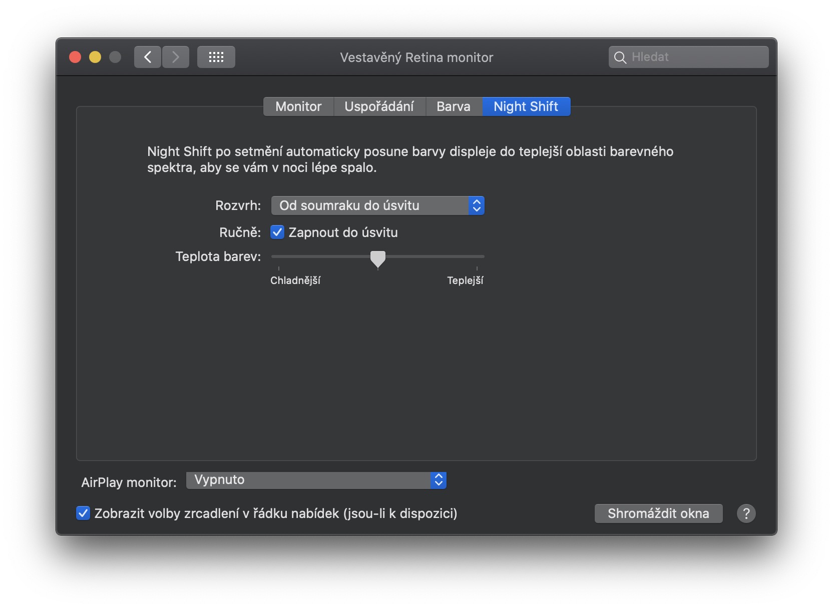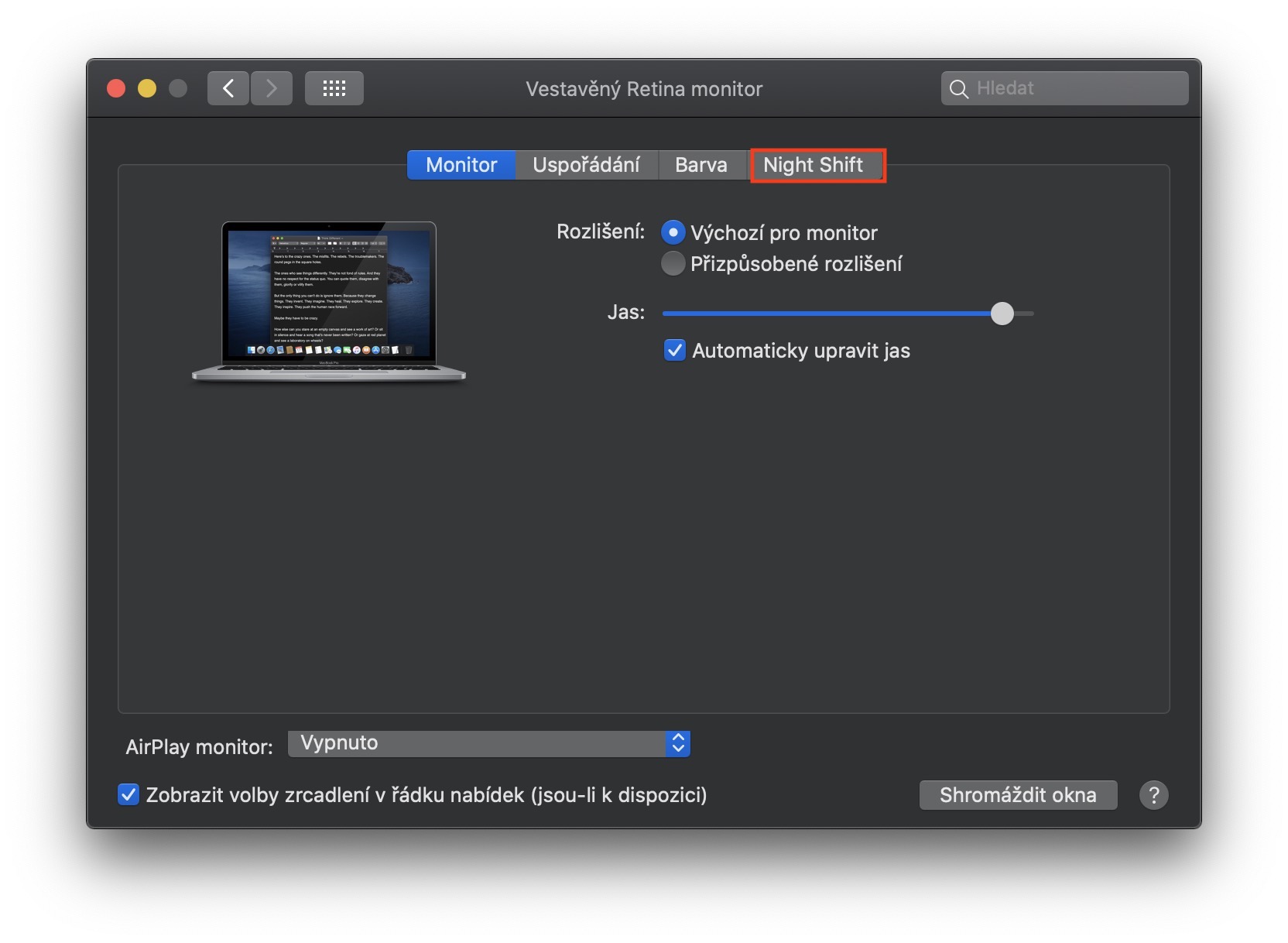 Pokud plánujete váš nový Mac či MacBook používat v noci a ve večerních hodinách, měli byste si nastavit Night Shift. Ten totiž podle nastavení aktivuje filtr pro odstranění modrého světla, díky čemuž se vám poté bude lépe usínat a ráno se budete probouzet lépe vyspaní. Pro nastavení Night Shiftu klikněte v levém horním rohu na ikonu , a poté z menu vyberete Předvolby systému… V novém okně rozklikněte možnost Monitory a v horním menu klikněte na možnost Night Shift. Zde už si nastavte rozvrh podle toho, kdy se má Night Shift spouštět, a kdy vypínat.