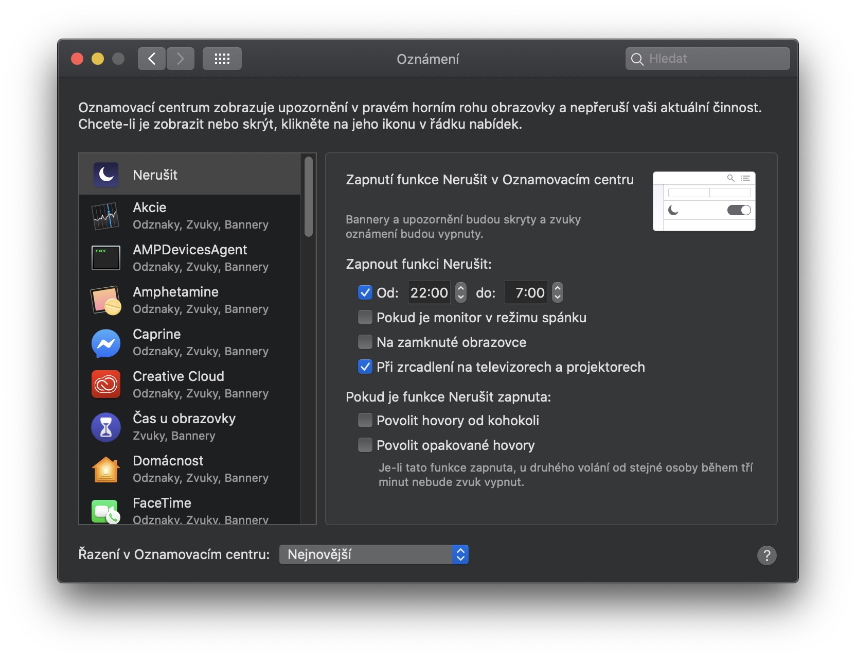 Nedílnou součástí operačního systému macOS jsou také notifikace. Díky nim můžete být pořád v obraze – ať už jde o cokoliv. Dokonce se vám v rámci notifikací mohou zobrazovat i naše články. Rozhodně ale nechcete, aby vás notifikace otravovaly někdy pozdě v noci. Proto se hodí nastavení režimu Nerušit. Ten si můžete přizpůsobit kliknutím na ikonu v levém horním rohu, a poté vybráním možnosti Předvolby systému… V novém okně stačí rozkliknout možnost Oznámení, a poté se v levém menu přesunout do sekce Nerušit. Zde už můžete režim Nerušit spravovat. a