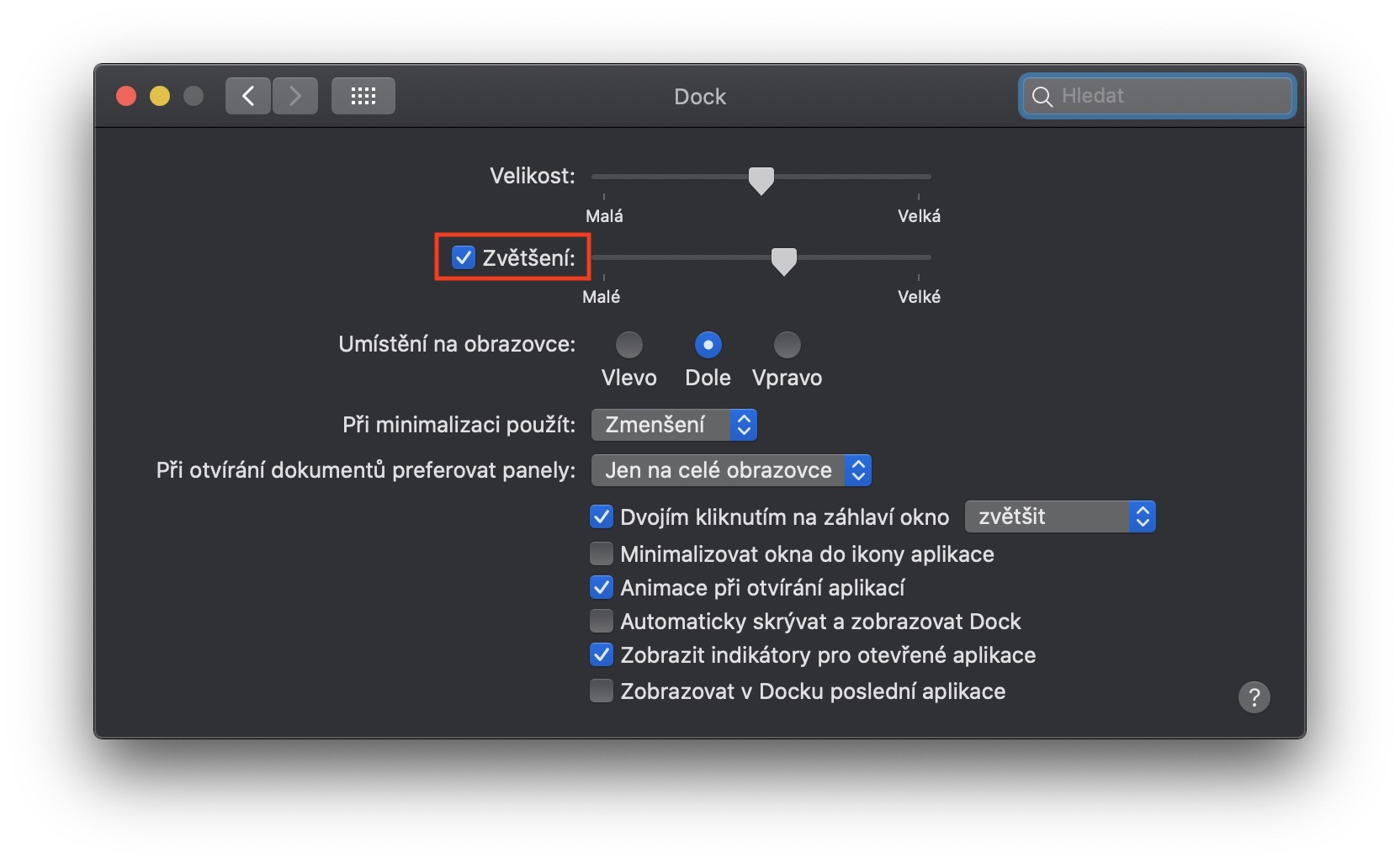 Mnoho uživatelů používá ke své každodenní práci také Dock. I ten si můžete v rámci macOS různě nastavit. Ve výchozím nastavení má například Dock nastaveno až příliš velké zvětšení po najetí myši, což se mnohým uživatelům nelíbí. Nastavení této možnosti najdete tak, že v levém horním rohu kliknete na ikonu , a poté z menu vyberete Předvolby systému… V novém okně, které se zobrazí, vyberete možnost Dock, kde už stačí možnost pro Zvětšení odškrtnout, anebo si jej přizpůsobit. Kromě toho si zde můžete nastavit automatické skrývání Docku, ponechání posledních otevřených aplikací v Docku, apod.