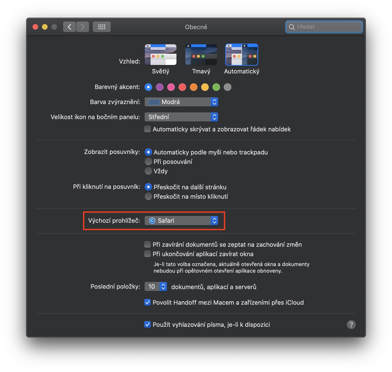 Ve výchozím nastavení je defaultním prohlížečem Safari. Pokud jste zjistili, že vám tento prohlížeč z nějakého důvodu nevyhovuje, tak jej samozřejmě můžete změnit. Nejdříve si stáhněte jiný prohlížeč, a poté v levém horním rohu klikněte na ikonu a z menu vyberete Předvolby systému… Otevře se nové okno, kde klikněte na možnost Obecné, kde rozklikněte možnost Výchozí prohlížeč a zvolte alternativní.