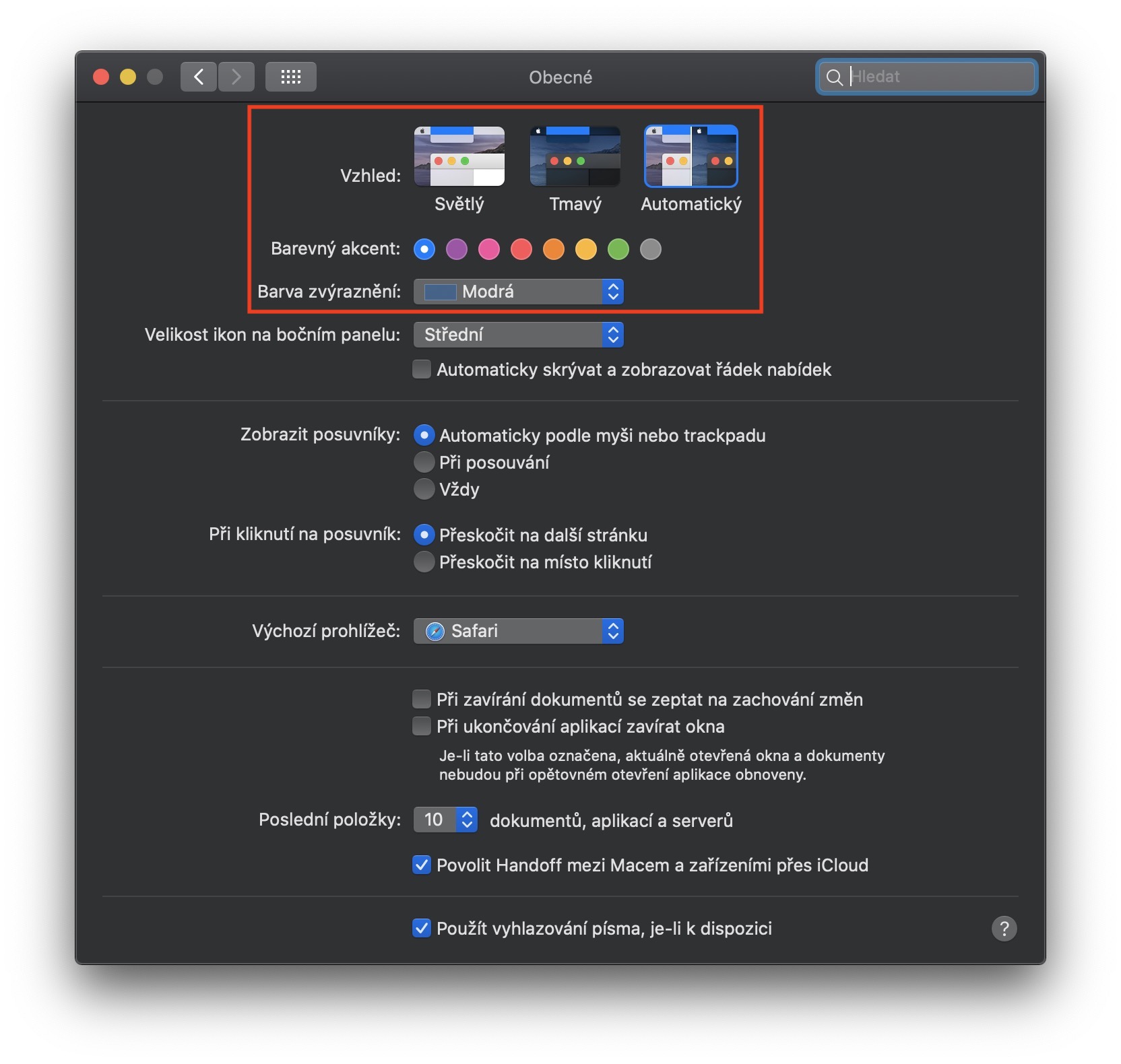 Hned při prvotním zapnutí Macu jste si mohli zvolit, zdali chcete využít světlý anebo tmavý režim. Pokud jste své rozhodnutí přehodnotili, anebo pokud jednoduše chcete vědět, jak vypadá druhý režim, tak klikněte levém horním rohu klikněte na ikonu , a poté z menu vyberete Předvolby systému… Otevře se nové okno, kde klikněte na možnost Obecné. Zde už si můžete zvolit režim Světlý, Tmavý anebo Automatický. Vyzkoušejte si také změnu barevného akcentu podle svého gusta.