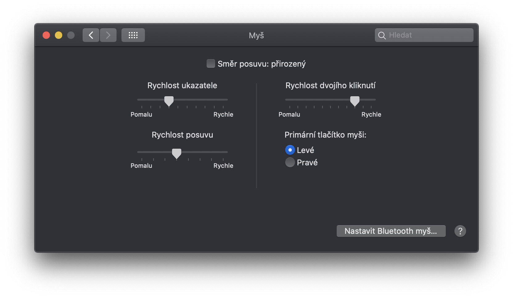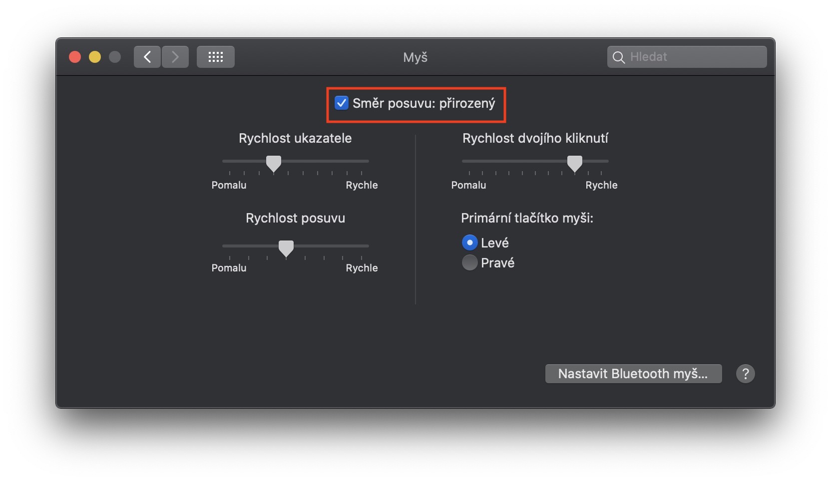 Pro někoho z vás, především při přechodu z Windows, nestandardní posouvání pomocí myši či Trackpadu – na zařízeních s macOS je totiž naopak. Pokud byste tohle nastavení chtěli změnit a zajistit, aby bylo posouvání stejně, jako na Windows, tak klikněte v levém horním rohu na ikonu a z menu vyberte možnost Předvolby systému… V novém okně poté vyberte možnost Myš a odškrtněte možnost Směr posuvu: přirozený. Kromě toho si zde můžete nastavit citlivost myši a další.