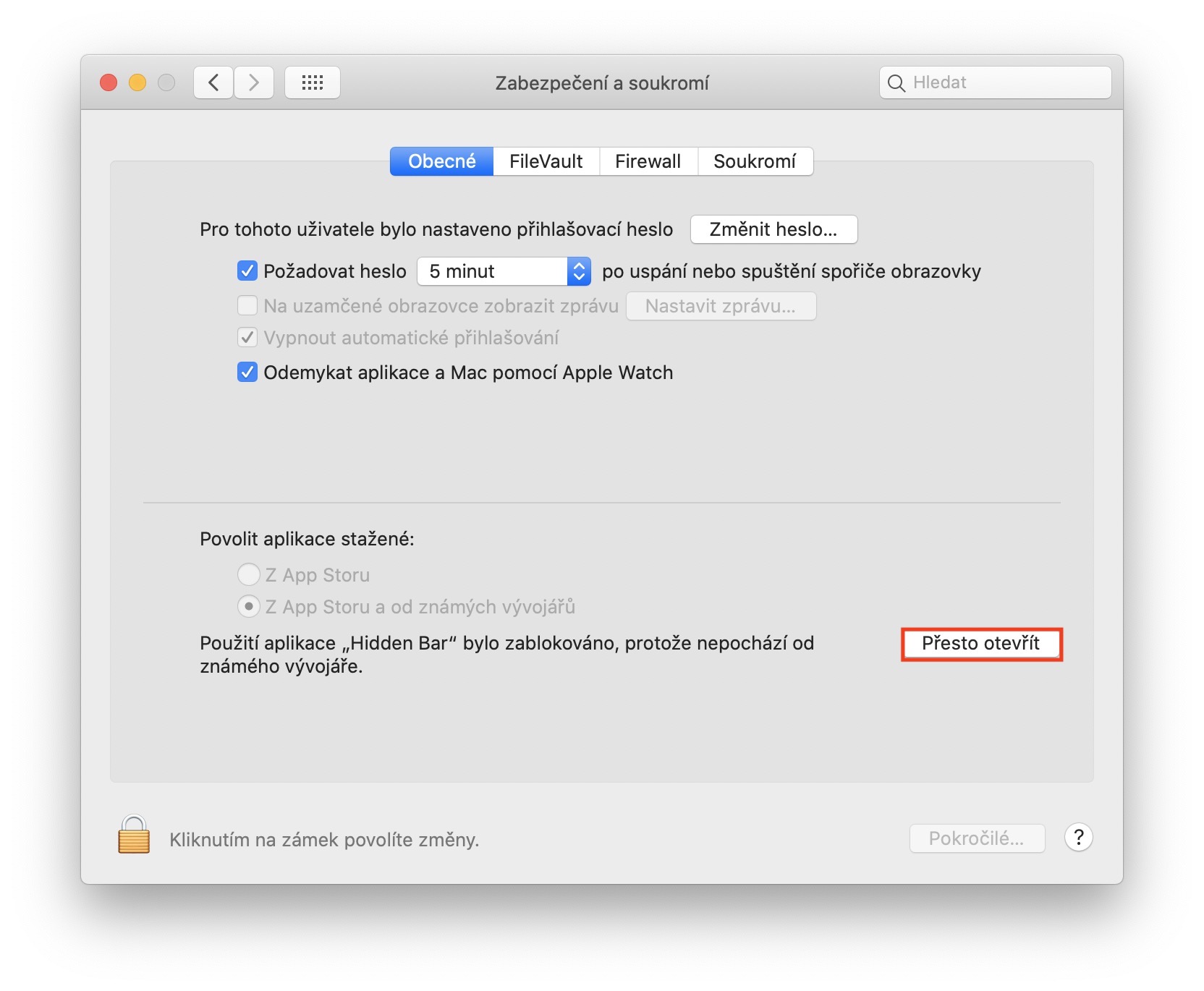 Aplikace Hidden Bar je volně dostupná ke stažení, a to naprosto zdarma – stačí kliknout na tento odkaz a stahování ihned započne. Po stažení se vám na disku objeví klasický .DMG soubor, na který stačí dvakrát poklepat. Po otevření stačí, abyste ikonu aplikace Hidden Bar přesunuli do složky Aplikace. Jakmile tak učiníte, tak odsud aplikaci spusťte. Může se objevit upozornění o tom, že nelze aplikace otevřít – v tomto případě přejděte do Předvoleb systému -> Zabezpečení a soukromí, kde klepněte na možnost Přesto otevřít. Po spuštění se vám otevře okno s nastavením aplikace Hidden Bar. Doporučuji ihned zaškrtnout možnost Start Hidden Bar when I log in, aby se aplikace automaticky po přihlášení zapínala. Kromě nastavení se vám v horní liště objeví dvě nové ikony – | a >. Logika těchto ikon je jednoduchá – cokoliv vložíte nalevo od |, tak se po kliknutí na > rozevře či zavře. Nyní už tedy stačí, abyste všechny ikony, které chcete v horním menu skrývat, přesunuli doleva za |. Poté stačí pro rozbalení či sbalení klepnout na ikonu > či < v horní liště. Ikonu > a | si můžete samozřejmě v horní liště přesunout tam, kde vám to bude vyhovovat.