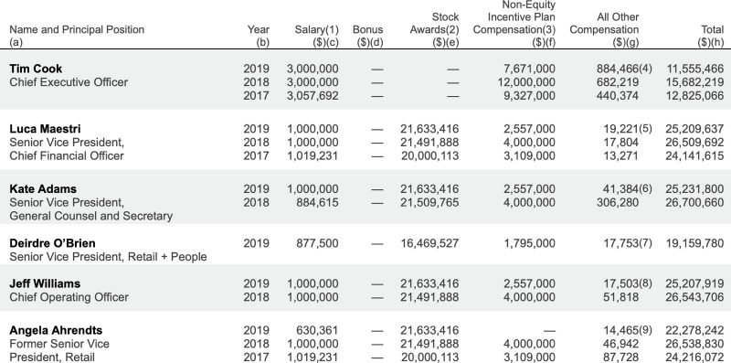 Na nízké platy si rozhodně nemůže stěžovat ani zbytek užšího vedení Applu. “Základ” většiny z nich se totiž pohybuje kolem 1 milionu dolarů, přičemž v bonusech jim Apple vyplácí další v průměru 2,5 milionu dolarů. Z dokumentů rovněž vyplývá, že mnoho z předních pracovníků Applu dostalo akcie v pohádkové hodnotě atakující ve většině případů 22 milionů dolarů. Poměrně zajímavé je, že na krásné peníze si v loňském roce přišla i dnes již bývalá šéfka maloobchodu Angela Ahrendts, která svůj odchod z Applu oznámila již v únoru minulého roku, aby mu v dubnu dala definitivní sbohem. Apple jí totiž za loňské relativně krátké působení ve firmě vyplatil téměř stejnou částku jako třeba finančnímu řediteli Lucovi Maestrimu.