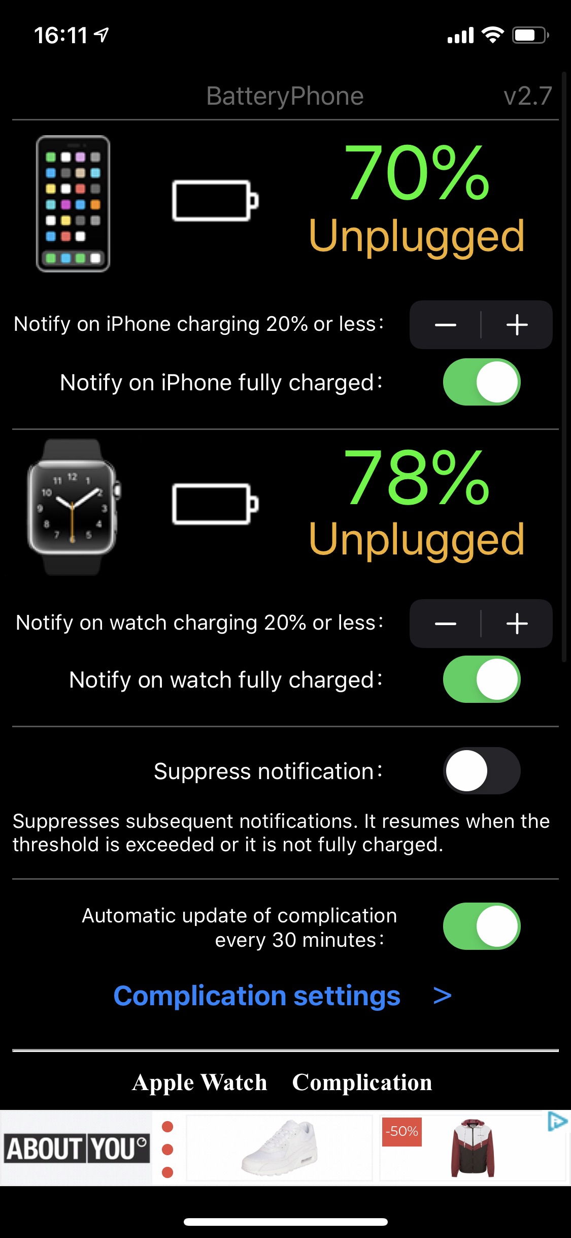 Některým z vás se budou zajisté hodit i možnosti nastavení notifikací na vybitou (či vybíjející se) baterii v případě, že její procenta klesnou pod vámi nastavené hodnoty. Notifikace vám v takovém případě dojde jak na Apple Watch, tak se objeví i na displeji iPhonu a vy si tak můžete být jisti tím, že jí v žádném případě “nezazdíte”. Nastavit pak lze i notifikace upozorňující na dobití jednoho či druhého zařízení. To vše přitom zcela zdarma a kompatibilní se všemi iZařízeními s iOS 11.0 a vyšším softwarem, potažmo watchOS 4.0 a vyšším softwarem.