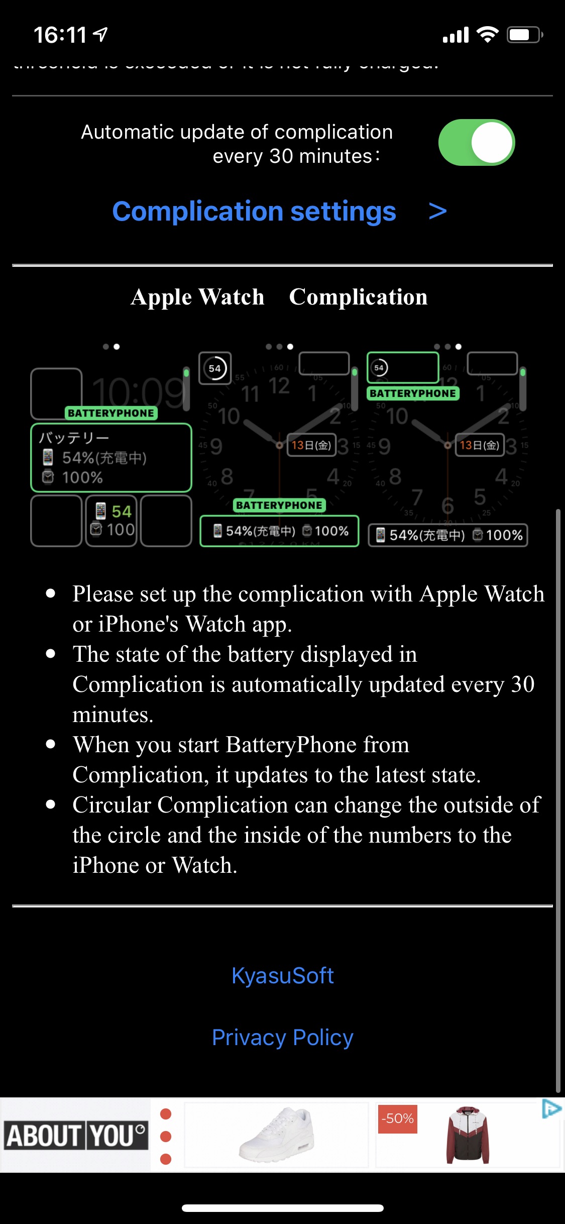 Princip aplikace je naprosto jednoduchý. Po stažení z iOS App Storu a její následné instalaci na Apple Watch vám totiž začne okamžitě na hodinkách ukazovat stav baterie iPhonu a dokonce i to, zda je připojen k nabíječce či nikoliv. Osobně velmi oceňuji i to, že má watchOS verze aplikace i vlastní komplikaci umístitelnou do ciferníku, která nefunguje jen jako “proklik”, ale jako ukazatel stavu baterií jak iPhonu, tak Apple Watch. Pokud jste tedy stejně jako já zvyklí mít na ciferníku stav baterie, můžete jej jednoduše nahradit právě touto komplikací, která posune tento prvek na novou úroveň a to při zachování hezkého grafického kabátku. Jasně, vměstnání ukazatele baterie iPhonu a Apple Watch si vyžádalo určitých kompromisů především ve formě velikosti procent baterie, avšak jak v případě Apple Watch 42 mm, tak 44 mm není s čitelností problém. U menších modelů jsem neměl bohužel možnost komplikaci otestovat, nicméně nemyslím si, že bychom se zde dostali do jakýchkoliv větších potíží.