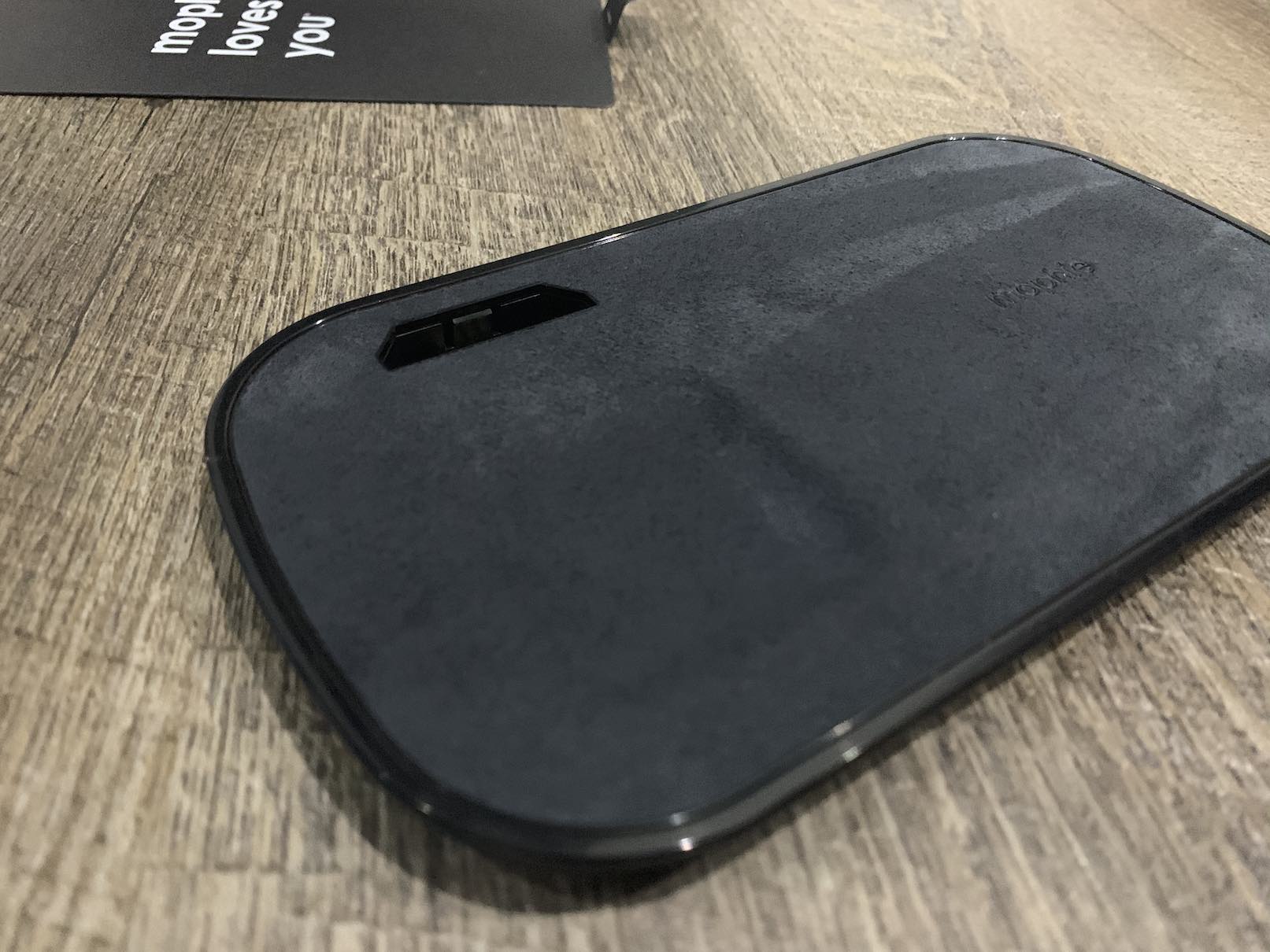 Pokud bych měl zhodnotit zpracování a design bezdrátové nabíječky Mophie 3v1 jedním slovem, použil bych slovo vynikající. Během několikadenního používání jsem nepřišel snad ani na jediný prvek, který by mi na nabíječce nevyhovoval. Samotná nabíječka je vyrobena z plastu, avšak velmi zajímavá je přední plocha, na kterou pokládáte svá zařízení. Tento povrch vám může na dotek připomínat semiš, automobilovým nadšencům poté Alcantaru. S tímto povrchem máte 100% jistotu, že nedojde k poškrábání zařízení, které na nabíječku budete odkládat. Při bližším zkoumání zjistíte, že je v nabíječce vytvořen malý výlis přesně na velikost AirPods (klasických), které při nabíjení do tohoto výřezu perfektně zapadnou. Vedle nabíječky pro AirPody se poté nachází odkládací plocha pro nabíjení iPhonu. Na spodní části nabíječky poté naleznete protiskluzovou gumu, která se stará o to, aby vám nabíječka nesjela ze stolu. Na přední straně poté najdete ještě dvě bílé LED diody, které vás informují o aktivním nabíjení.