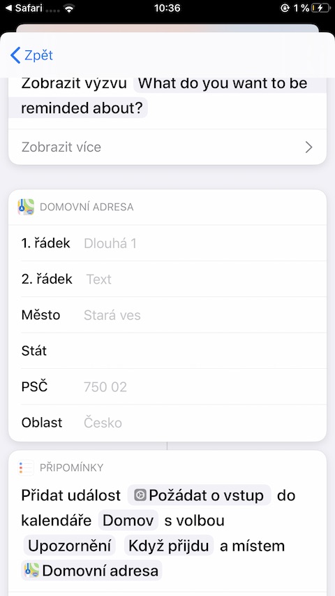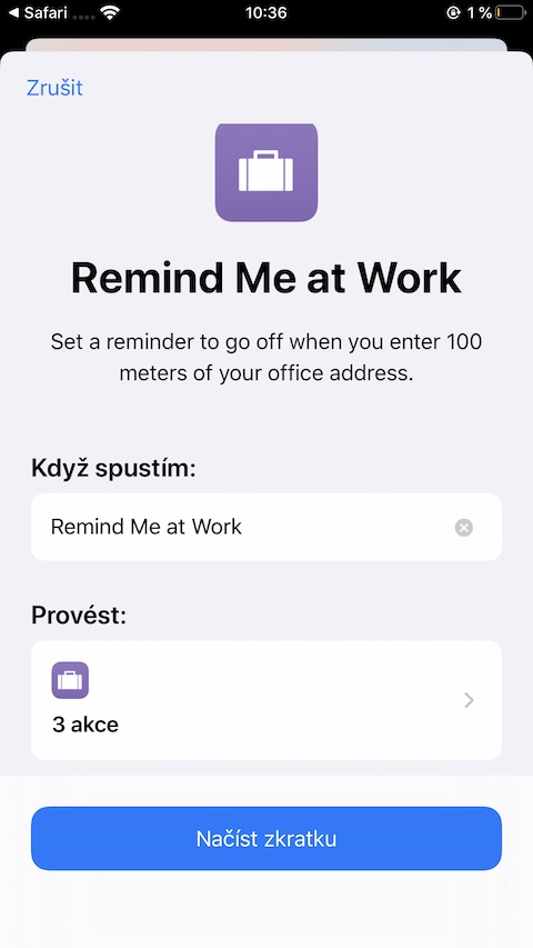 Zkratka, která vám na konkrétním místě připomene vámi zadaný úkol, se hodí vždy, všem a všude. Společnost Apple zamýšlela její použití původně pro případy, kdy potřebujete něco připomenout po svém příjezdu do práce (nebo odjezdu z ní), použít ji ale můžete i v jiných případech a na jiných místech. Zkratka je velice jednoduchá. Stačí do ní jen zadat adresu vašeho pracoviště (školy, domova, nebo jiného místa, se kterým si zkratku chcete spojit – toto místo můžete pochopitelně kdykoliv libovolně upravit). Poté budete informováni o každé připomínce, související s danou polohou.