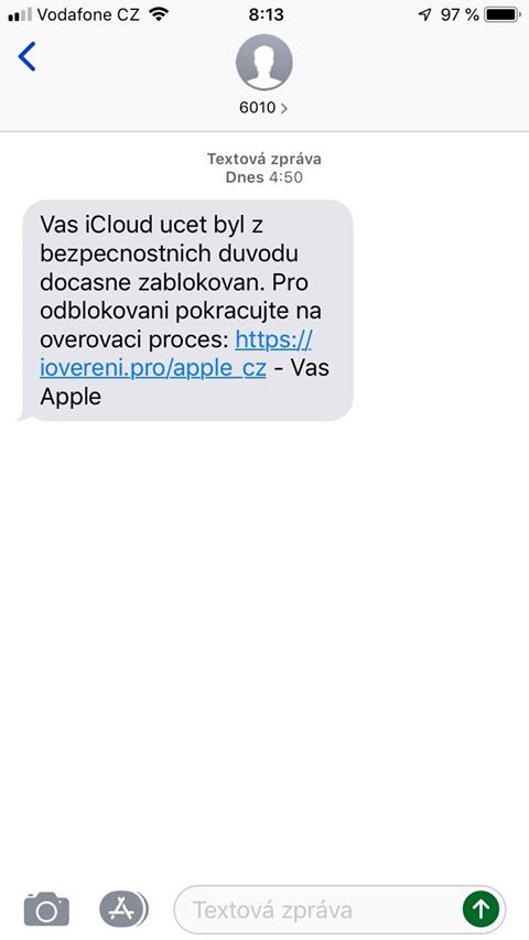 Mi přišla SMS z čísla 6010 s odkazem pro odblokování na: presmeruj.me/Apple