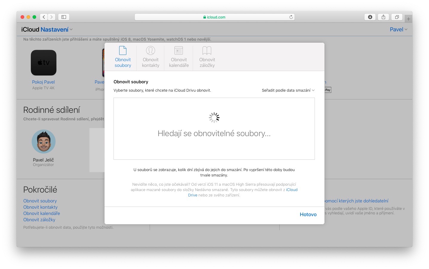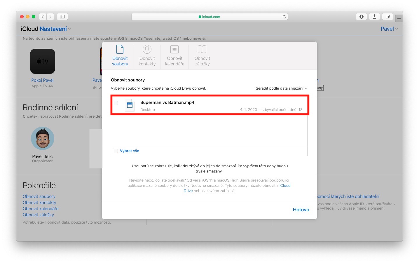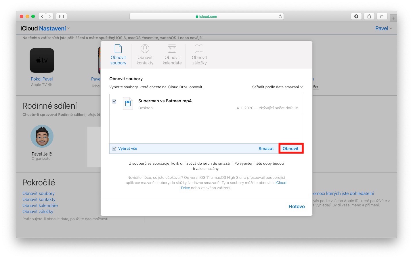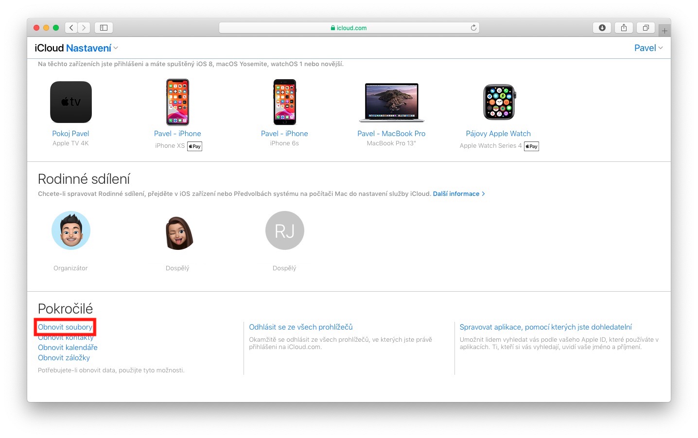 Na vašem Macu či MacBooku přejděte do jakéhokoliv webového prohlížeče a otevřete stránku icloud.com. Zde se přihlaste ke svému Apple ID účtu. Po přihlášení se objevíte v rozhraní aplikací, kde uprostřed klikněte na tlačítko Nastavení účtu. Zde se poté zobrazí seznam všech vašich zařízení a možností pro správu rodinného sdílení. Níže, v sekci Pokročilé, poté najdete možnosti pro obnovu dat. V případě obnovení dat z iCloud Drive stačí kliknout na možnost Obnovit soubory. Webové rozhraní iCloudu se poté pokusí najít všechny obnovitelné soubory. Pokud chcete nějaký ze souborů obnovit, tak jej označte, a poté zvolte možnost Obnovit. Tímto se soubor objeví na tom místě, odkud byl původně odstraněn. Zároveň můžete ve webovém rozhraní iCloudu obnovit také kontakty, kalendáře a záložky.