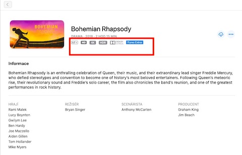 U vybraných pořadů si můžete všimnout značek a symbolů týkajících se toho, v jakých formátech můžete filmy sledovat. Jedná se například o 4K , Dolby Vision, Dolby Atmos nebo HDR. Pokud vedle názvu filmu vidíte poznámku “CC” nebo “SDH”, znamená to, že film obsahuje skryté titulky nebo titulky pro neslyšící a sluchově handicapované. Značka “AD” zase signalizuje, že u filmu je možné aktivovat audio stopu pro popis scén, ve kterých chybí mluvené slovo. Poznámka “iTunes Extra” zase znamená, že součástí filmu jsou bonusové materiály – vystřižené scény, trailery, komentář nebo galerie. Bonusový obsah zobrazíte po spuštění filmu po kliknutí na nápis “Extras” v pravém dolním rohu.