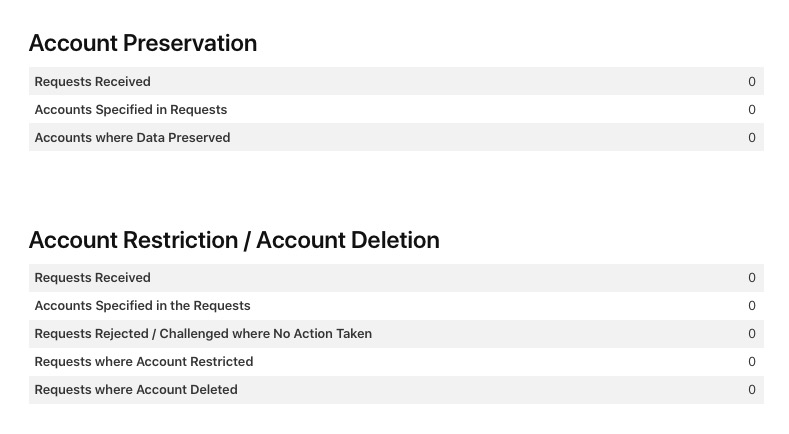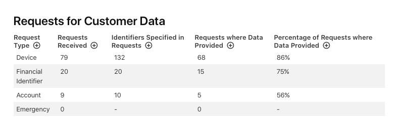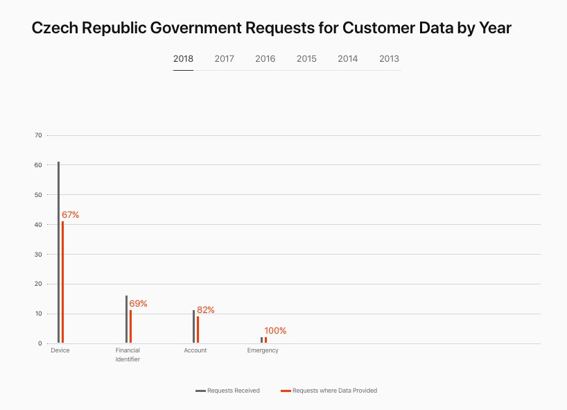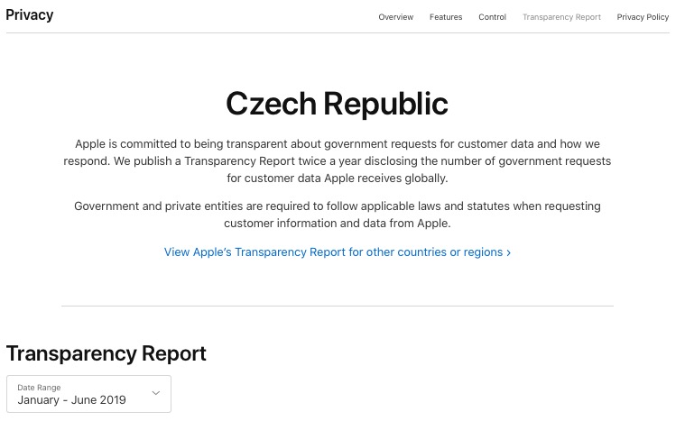 Kvůli nařízení ministerstva spravedlnosti musí společnost Apple zveřejňovat tento druh údajů o šest měsíců později, zmíněná data tedy pokrývají období od 1. ledna loňského roku do 30. června loňského roku. V průběhu tohoto období přijal Apple 31 778 vládních žádostí – od počtu žádostí, přijatých v roce 2018, se tento počet liší zhruba o stovky. Zmíněné žádosti se týkaly celkem 195 tisíc zařízení a v 82 % případů byla společnost Apple schopná odpovědným organizacím poskytnout žádaná data. Nejvíce žádostí – tedy více než 13 500 – pochází z Německa, ve Spojených státech bylo podáno 4 796 žádostí. V České republice bylo podáno celkem 79 žádostí týkajících se 132 zařízeních, Apple v případě České republiky vyhověl 86 % těchto žádostí.