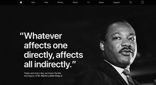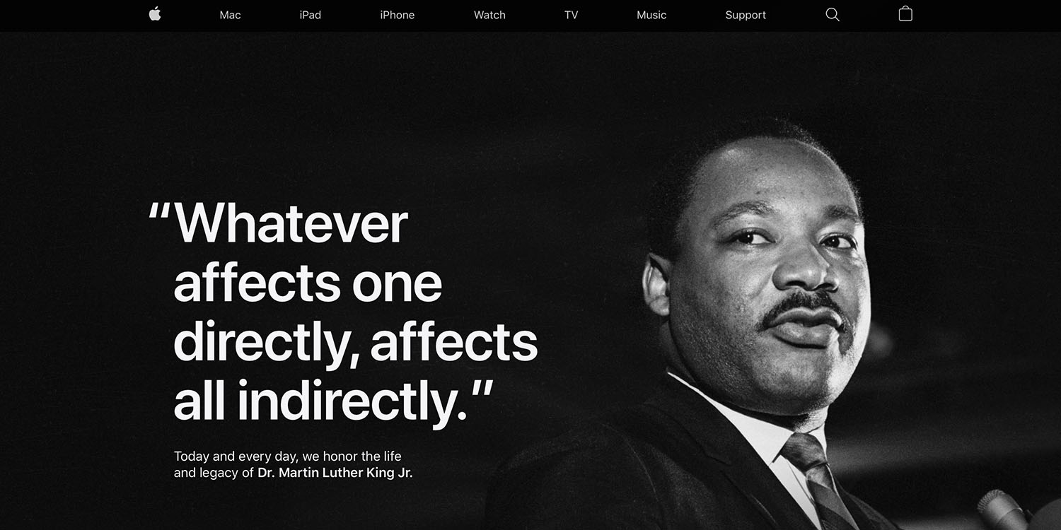 Apple čas od času na svých stránkách vzpomíná na významné dny a zemřelé osobnosti. Pravidelně je oslavován taktéž Den Martina Luthera Kinga připadající na 20. leden, jakožto významného bojovníka za základní lidská práva. Byť se tento laureát Nobelovy ceny za mír (1964) narodil 15. ledna, jeho den se slaví různě pár dní poté. Apple pravidelně vybírá jeden jeho citát, který umístí na svůj web. Jelikož je to ale člověk svázaný americkou historií, jde odkaz na něj vidět pouze na americké verzi webu. Apple pro tentokrát zveřejnil citát:“Whatever affects one directly, affects all indirectly.“