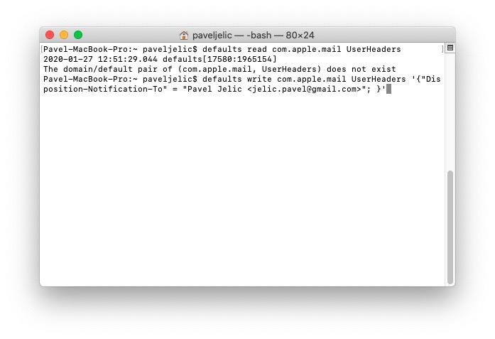 defaults write com.apple.mail UserHeaders '{"Disposition-Notification-To" = "Pavel Jelic "; }'