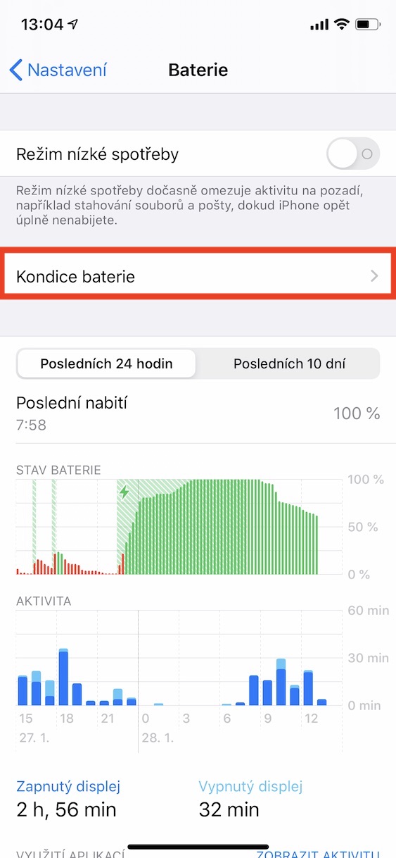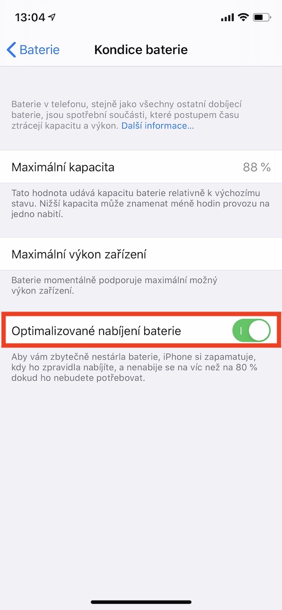 V rámci iOS 13 přibyla nová funkce Optimalizované nabíjení baterie. Díky této funkci může iPhone šetřit svou baterii tím, že ji přes noc nabije jen na 80 %, a poté několik minut před probuzením nabíjení opět povolí. Při probuzení bude mít teda váš iPhone přesně 100 %. Je však nutné, abyste měli pravidelný denní režim, který se iPhone musí naučit. Pokud každý den vstáváte jinak, tak tato funkce není určená pro vás a můžete ji deaktivovat. Učiníte tak v Nastavení, kde přejděte do sekce Baterie. Odsud stačí přejít do sekce Kondice baterie, kde funkci Optimalizované nabíjení baterie přepínačem deaktivujte.