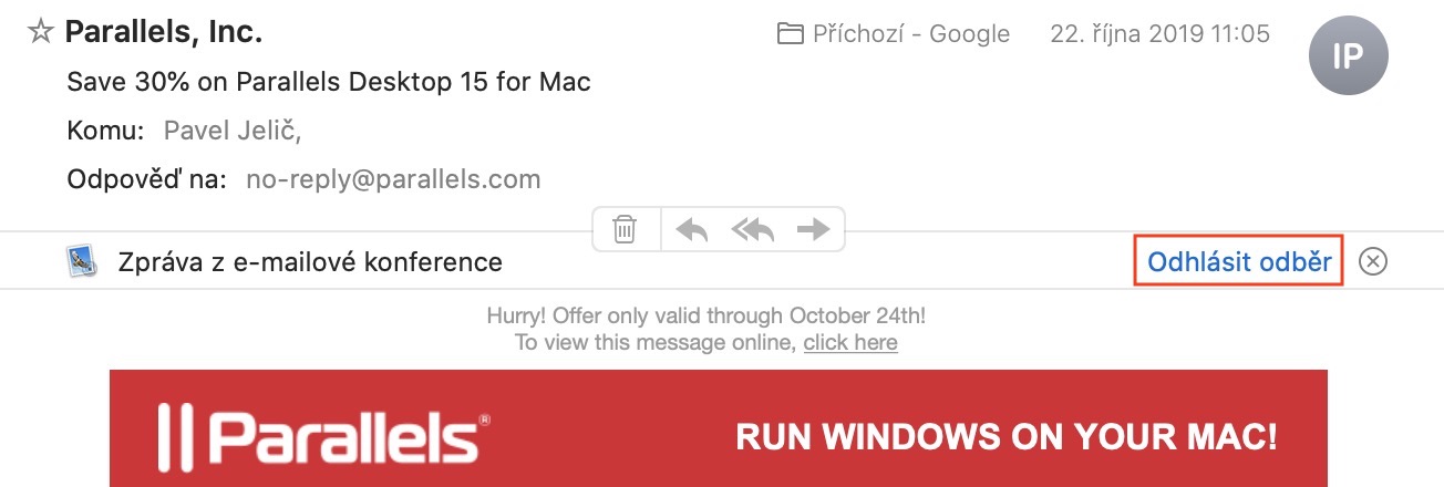 Mezi další ze zajímavých funkcí patří také možnost jednoduchého odhlášení odběru mailových konferencí. Pokud vám často do e-mailové schránky chodí mnoho zpráv s marketingovou propagací, či jiné nevyžádané zprávy s letáky a akcemi, tak dost možná víte, že se na konci takových mailů nachází malé tlačítko, díky kterému se můžete z odběru těchto zpráv odhlásit. Aplikace Mail vám však tohle „tlačítko“ dokáže přesunout na samotný vrch zprávy, aby bylo odhlášení o to jednodušší. Pokud Mail takový e-mail rozpozná, tak se vám pod hlavičkou mailu objeví malá lišta s textem Zpráva z e-mailové konference, kde v její pravé části stačí klepnout na modrý text Odhlásit odběr.