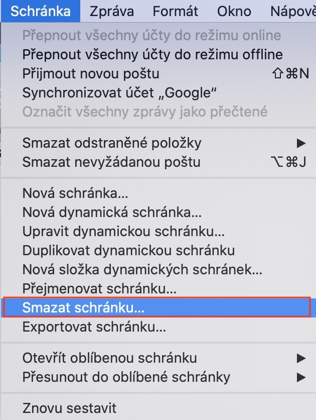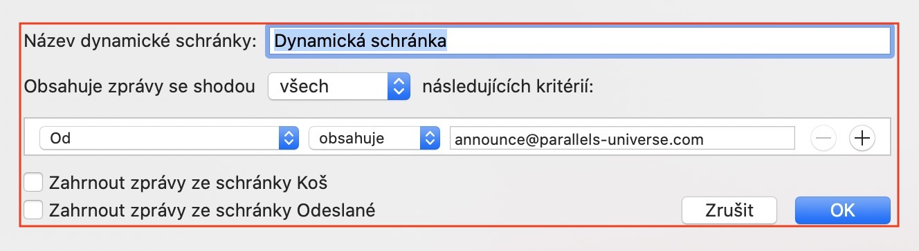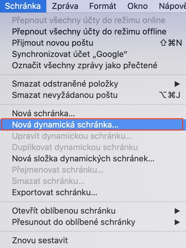 Velmi zajímavá je v aplikaci Mail možnost dynamických schránek. Dá se říct, že dynamické schránky patří mezi jednu z mála rozšířených funkcí, které aplikace Mail nabízí. V dynamických stránkách se zobrazují maily, které jsou uložené klidně v několika ostatních účtech, avšak splňují vámi nastavená kritéria. To se hodí například tehdy, kdy pracujete na určitém projektu a e-maily vám chodí do vícero schránek zároveň. Pro vytvoření dynamické schránky stačí, abyste v aktivním okně aplikace Mail kliknuli v horní liště na možnost Schránka, odkud poté vyberte možnost Nová dynamická schránka… Pomocí nabídek a textových polí poté stačí nadefinovat kritéria této schránky. Takto vytvořená dynamická schránka se poté objeví v levém panelu Mailu. Pro smazání dynamické schránky stačí, abyste ji označili v levém panelu, a poté v horní liště stisknuli záložku Schránky, kde klepněte na možnost Smazat schránku.