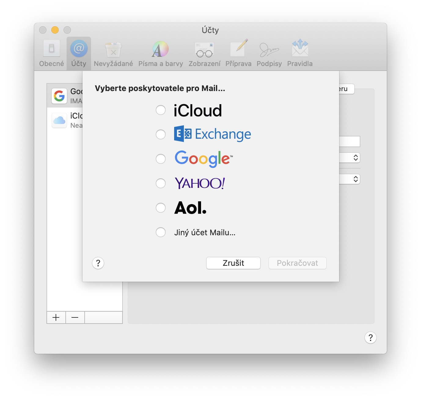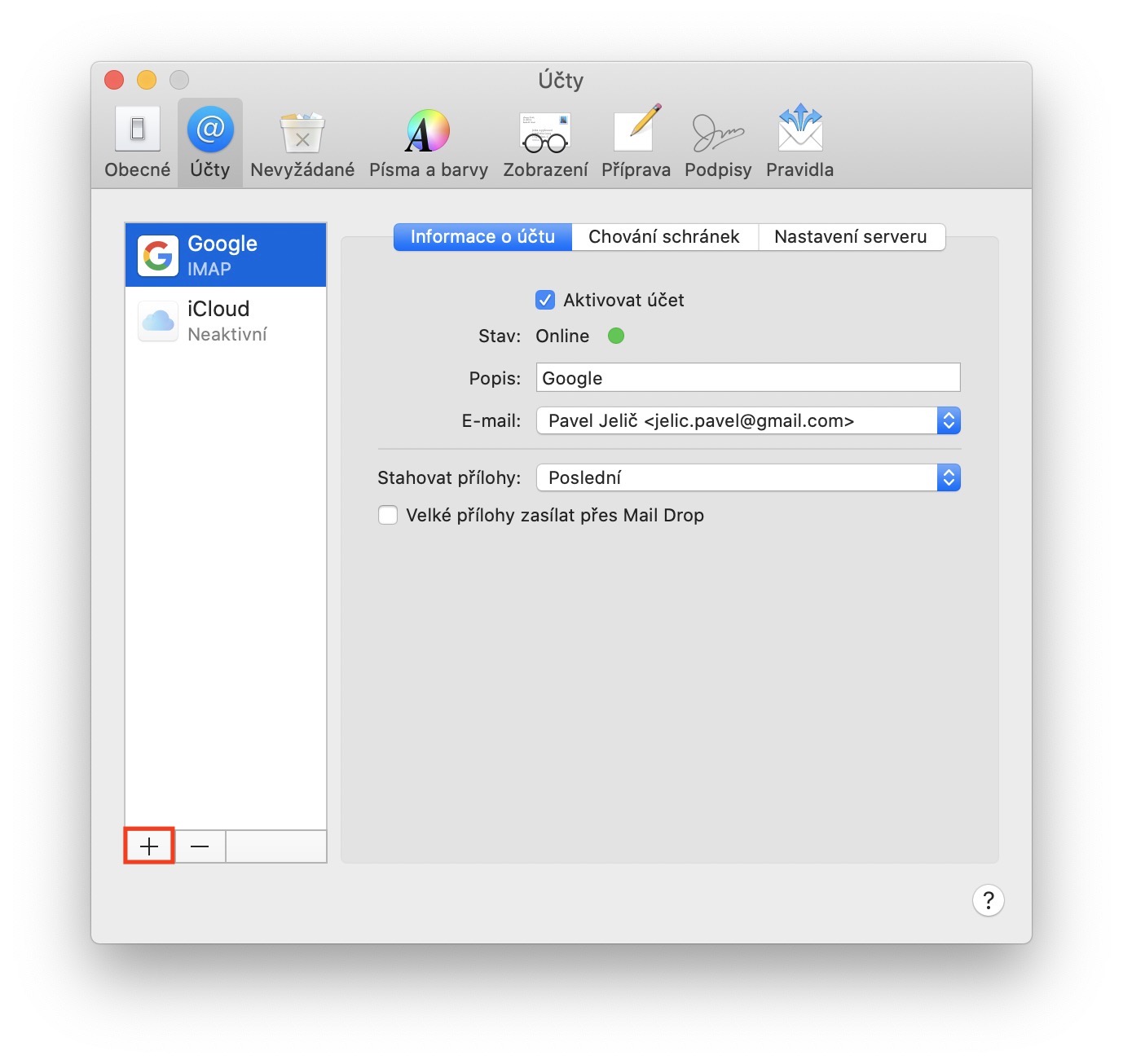 Přidání nového účtu do aplikace Mail na Macu je vcelku jednoduchou záležitostí. Stačí otevřít aplikaci Mail a v horní liště klepnout na tučnou záložku Mail. Poté vyberte možnost Předvolby… a v novém okně se v horním menu přesuňte do sekce Účty. Poté už jen stačí kliknout na ikonu + a vyplnit všechny potřebné informace o vašem účtě. Pokud se chystáte přidat e-mail například ze Seznamu, Centrumu či podobné služby, budete potřebovat zjistit server příchozí a odchozí pošty. Tyto informace naleznete v nápovědě každé z těchto služeb. U těchto účtů máte na výběr také POP a IMAP.