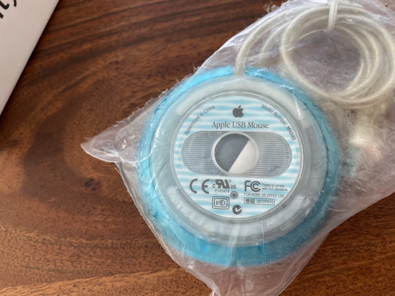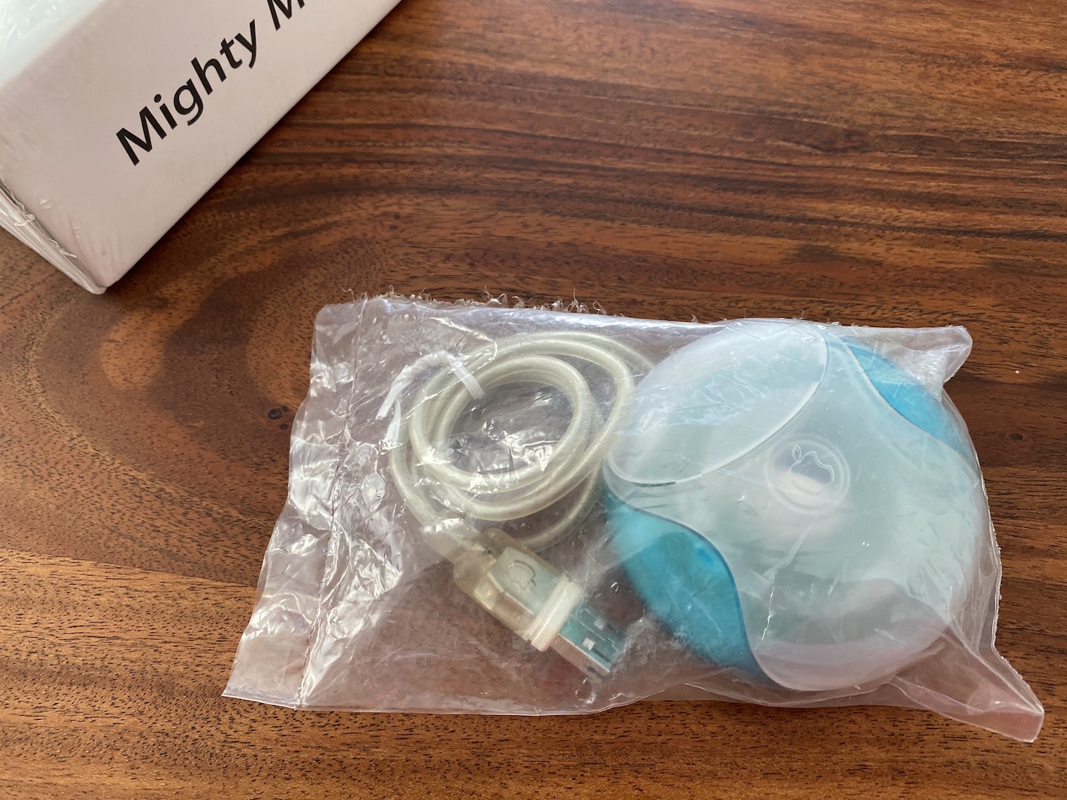 Zajímavostí je, že i když jsem se skutečně hodně snažil při hledání myšky od své sbírky, nikde jsem nenašel myš v nějakém jiném balení než v zataveném plastovém sáčku. Myš se totiž prodávala pouze jako příslušenství pro iMac a jediné oficiální balení, které se mi podařilo dohledat, byla krabice, ve které byla myš, dokumentace, CD a klávesnice právě k iMacu G3. Samotná myš v krabici se dle toho, co se mi podařilo najít, neprodávala a pokud ano, budu rád, když do komentáře pošlete odkaz na fotografii, ve které je krabička k této myši. Jediná možnost, jak koupit originálně zabalenou myš, je koupit kus, který byl určen pro servisy, jenž se dodával zatavený v igelitovém sáčka.