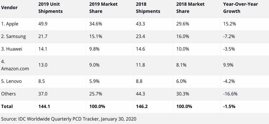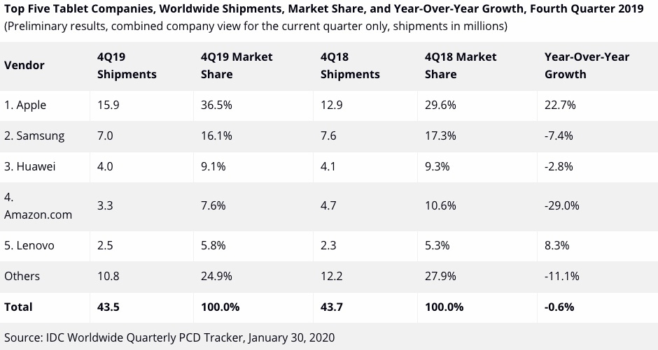 Ostatním výrobcům se však během podzimní a zimní sezóny příliš nedařilo, a ač Samsung obsadil druhou příčku a Huawei třetí, obě společnosti výrazně klesly. Zatímco v případě jihokorejského giganta se počet dodaných kusů propadl o 7,4%, čínský Huawei se dočkal 2,8% poklesu. Nejhůře na tom ale byl Amazon, v jehož případě nezabraly ani masivní slevy během Black Friday a Cyber Monday. Byť se jeho tablet Fire během roku prodával poměrně stabilně a v určitých chvílích rostl až o 10%, v posledním kvartálu nastal 29% propad. Lenovo, stále urputně držící páté místo v žebříčku, se sice během října a prosince těšilo 8.3% růstu, ale ten bohužel nezachránil zbytek roku a společnost čekalo zklamání v podobě 4.2% poklesu. Tak či tak si může Apple oddechnout, jen díky němu se totiž podařilo vyvážit ztráty ostatních výrobců, a celé odvětví se tak meziročně v posledním čtvrtletí propadlo pouze o 0.6%.