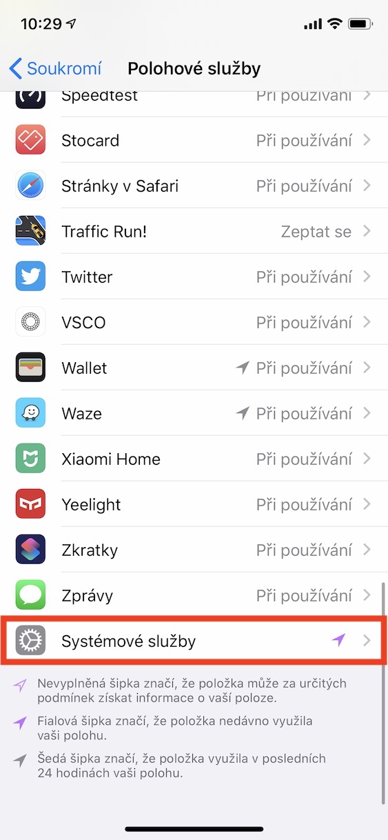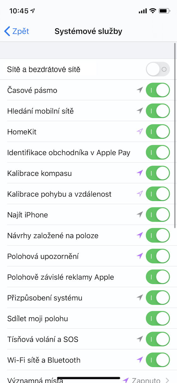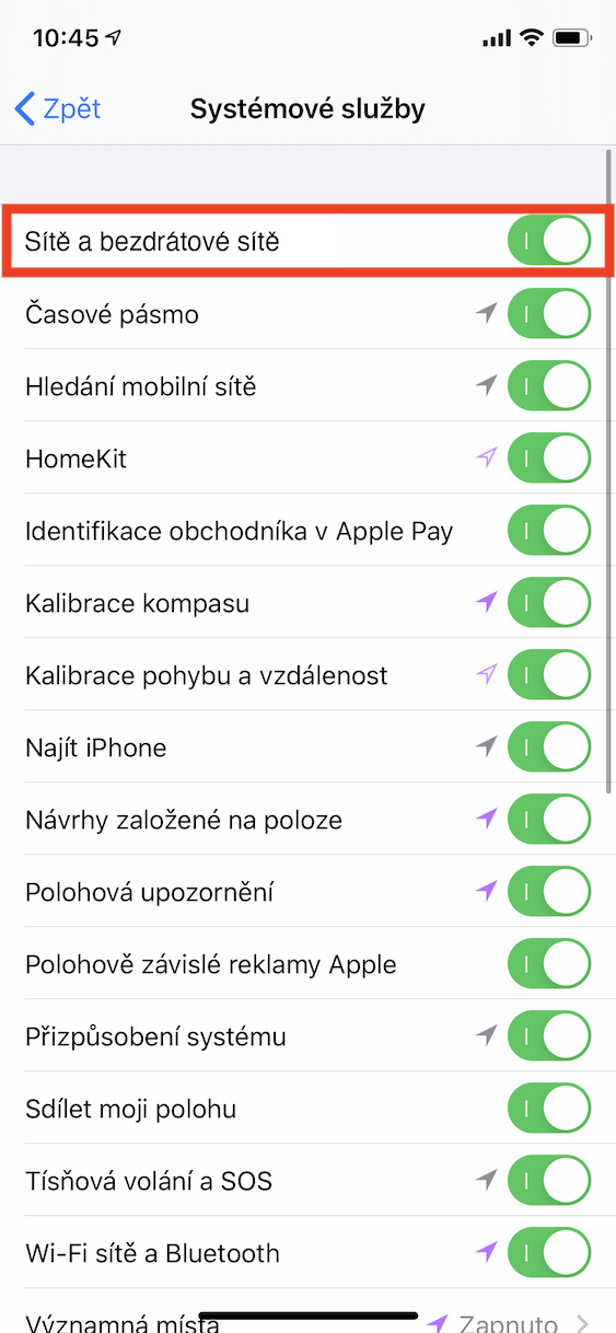 Na vašem iPhonu 11, 11 Pro či 11 Pro Max přejděte pro deaktivaci čipu U1 do nativní aplikace Nastavení. Jakmile aplikaci otevřete, tak se v ní posuňte o něco níže, dokud nenarazíte na možnost Soukromí, kterou rozklikněte. Jakmile tak učiníte, klepněte na první možnost Polohové služby. V této sekci sjeďte na samotný spodek, kde klepněte na kolonku Systémové služby. Tady už jen stačí, abyste pomocí přepínače deaktivovali možnost Sítě a bezdrátové sítě. Poté stačí deaktivaci potvrdit stisknutím tlačítka Vypnout.